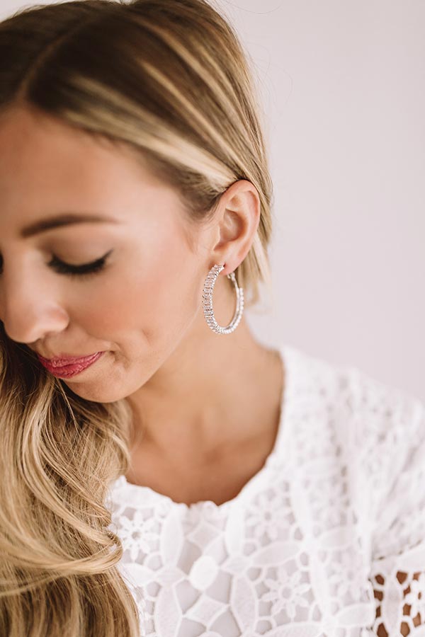 You will be "set for success" in these silver hoop earrings completely covered with glistening rectangle diamonds!