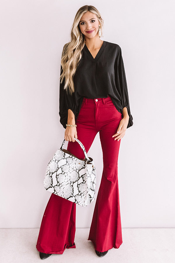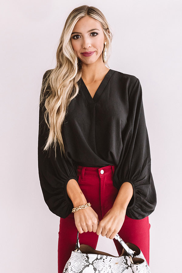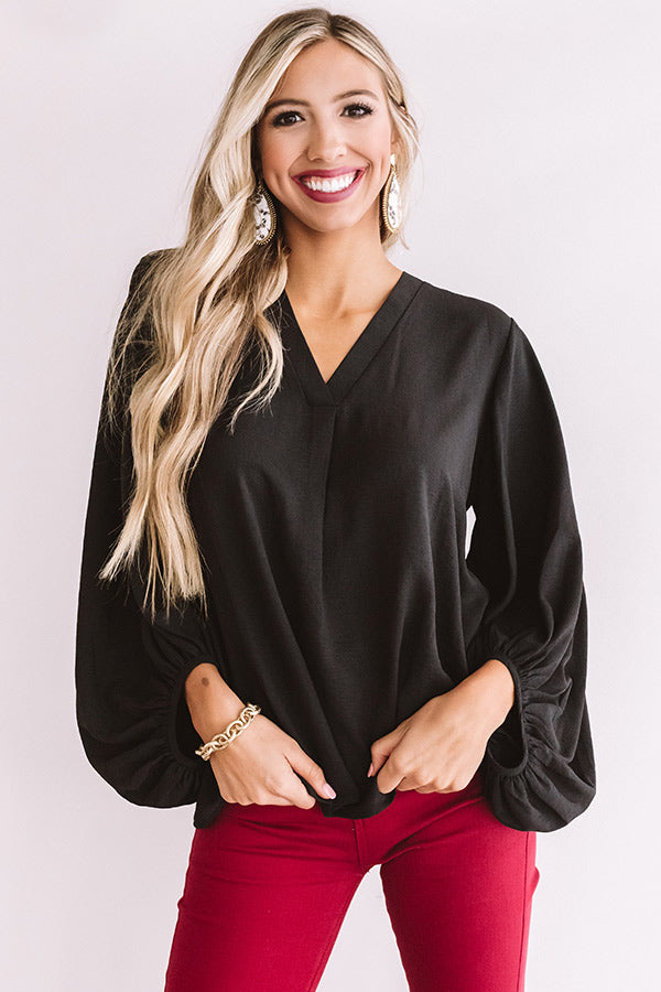 You will be "set for success" in this little black shift top featuring lightweight material, a thick rounded neckline with a v-cut notch, oversized bishop sleeves with elastic banded cuffs, and a relaxed bodice that falls into a straight hemline! This lightweight piece can be worn with red oversized flares, a black bootie, and a snake print statement earring and tote for a classic transitional outfit, or it can be paired with "The Jude Distressed Denim Skirt," a leopard hair scarf, and "The Jess Faux Suede Heel in Black" for more of a warm weather look! Measurements