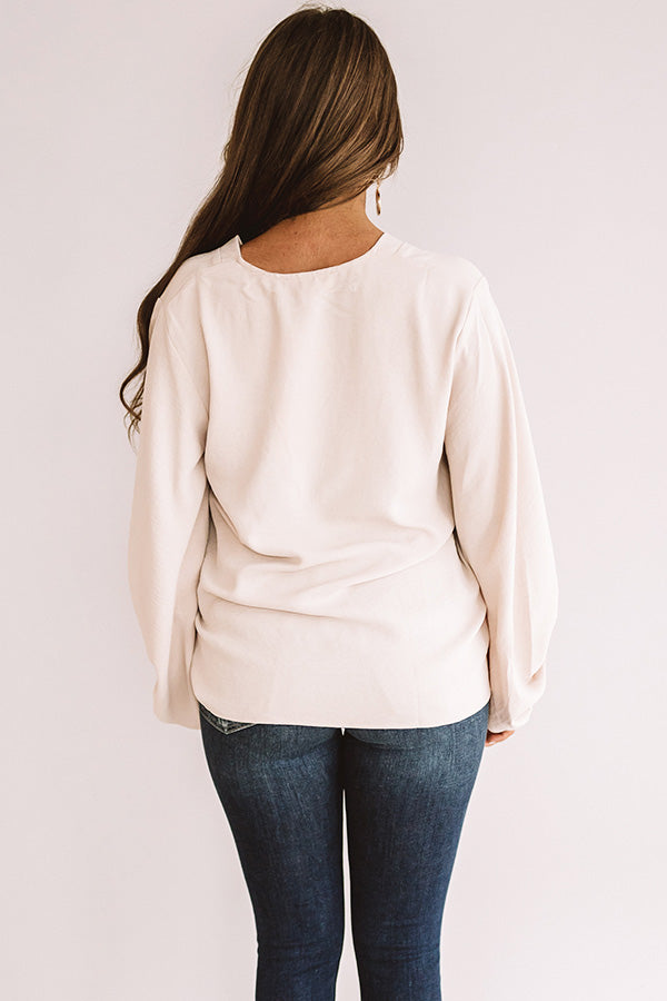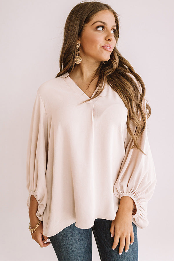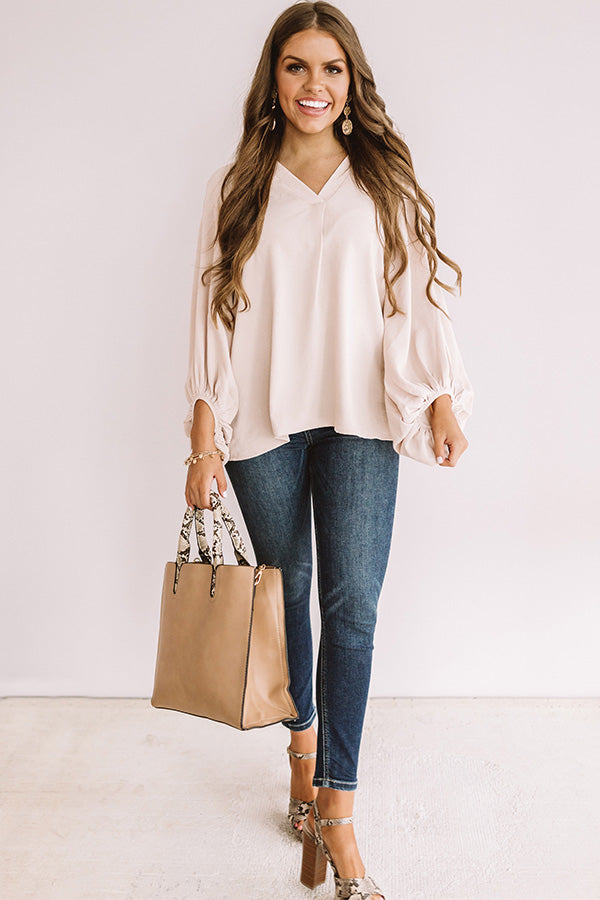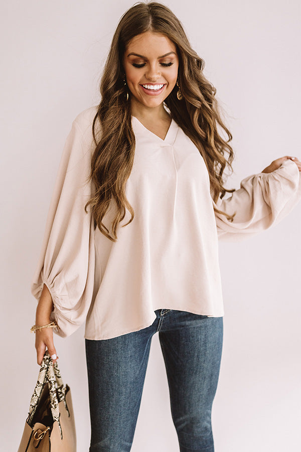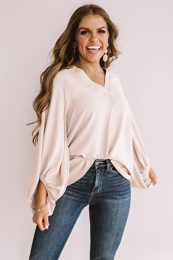 You will be "set for success" in this neutral shift top with its lightweight material, thick v-cut neckline, long oversized bishop sleeves with elastic banded cuffs, and a breezy silhouette that falls into an uneven hemline that looks great front tucked ! This lightweight piece can be worn with dark skinnies, snake print platform heels, and a tan tote for a classic transitional outfit or with "The Jude Distressed Denim Skirt" and our "Tipton Espadrille in Iced Latte" for more of a warm weather look! Measurements
