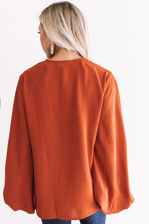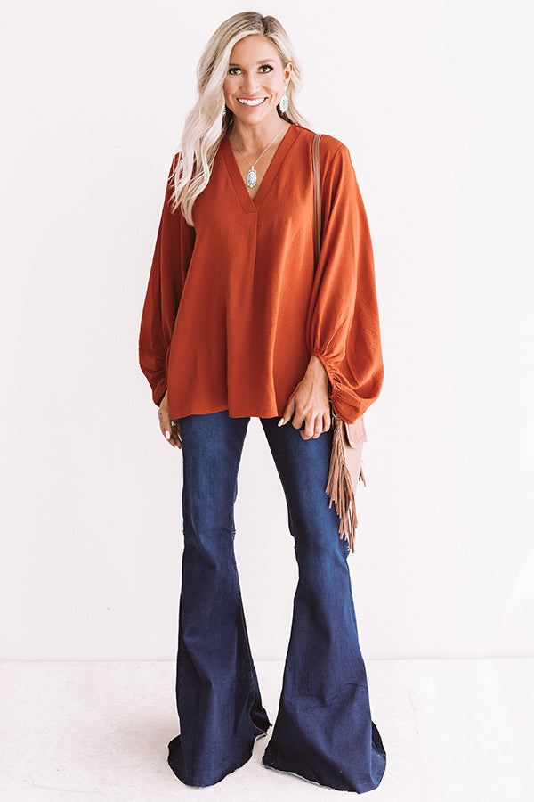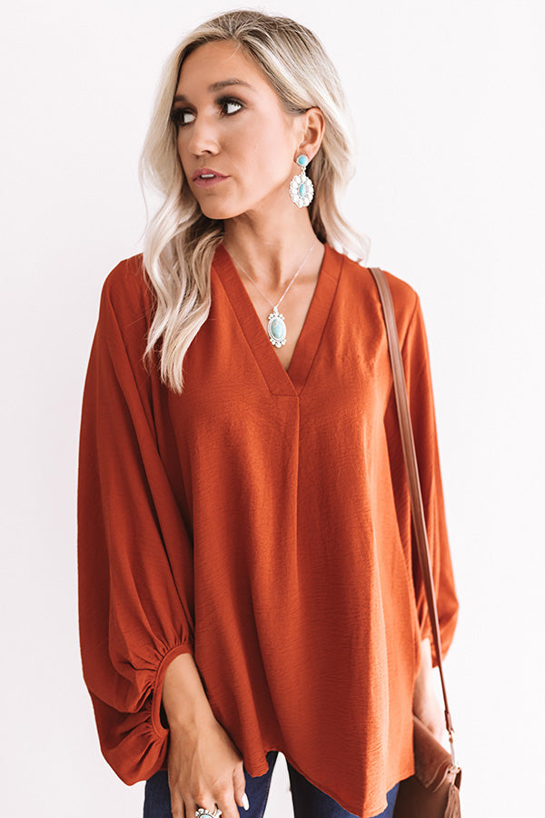 You will be "set for success" in this rust colored shift top featuring lightweight material, a thick rounded neckline with a v-cut notch, oversized bishop sleeves with elastic banded cuffs, and a relaxed bodice that falls into a straight hemline! This lightweight piece can be worn with distressed ankle skinnies, a long statement necklace, and a neutral cutout wedge and clutch for a classic transitional outfit, or it can be paired with "The Jude Distressed Denim Skirt" and "The Posey Bootie in Brown" for more of a warm weather look! Measurements