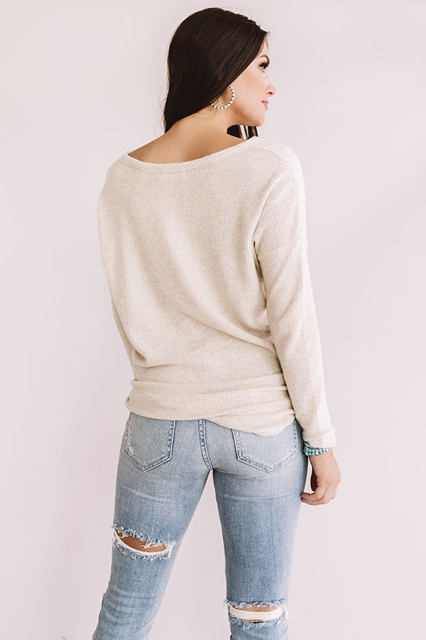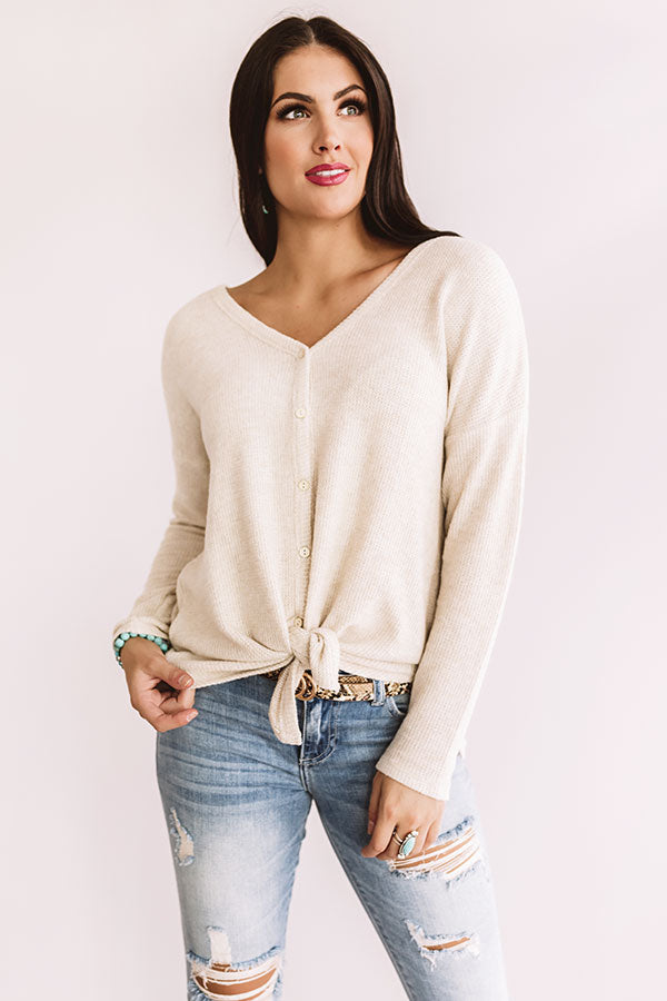 This casual stone top will set your fall style free with its soft lightweight material, subtle waffle knit texturing, wide v-cut neckline, long loose sleeves, and a relaxed button up bodice that falls into a knotted front hemline and a rounded back hem! We have styled this piece with some distressed ankle skinnies and a snake print bootie, but you can also layer it under our olive "Fall Fireside Jacket" with some black flares or a black skirt, an ivory faux suede hat, and "The June Bootie in Sage" for a variety of looks that are sure to turn heads!