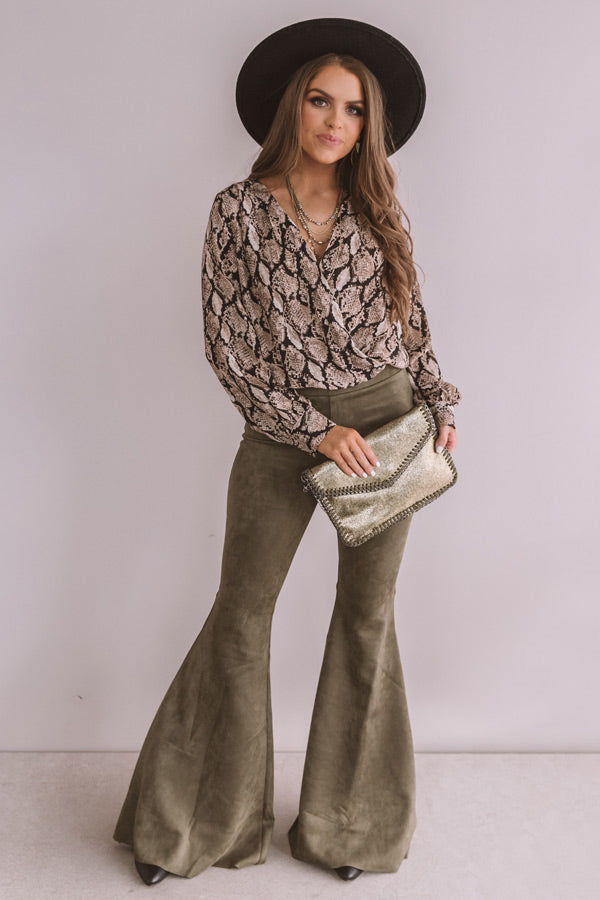 "Set the scene" in this flirty and fierce bodysuit featuring sleek lightweight material patterned with a bold black and neutral snake print, long loose bishop sleeves with fitted button closure cuffs, a relaxed wrapped front bodice with a deep v-cut, and a cheeky fit with a two snap closure! You can style this piece under any type of bottoms and wear any type of outerwear with it for a variety of looks that will carry you from season to season! Measurements