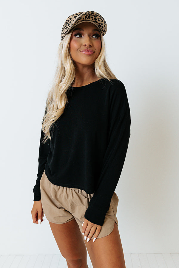 You will be set to snuggle when you wear this cozy black sweatshirt featuring ultra soft lightweight material, a high rounded neckline, long loose sleeves with fitted cuffs, and a relaxed silhouette that falls into a straight cropped hemline!