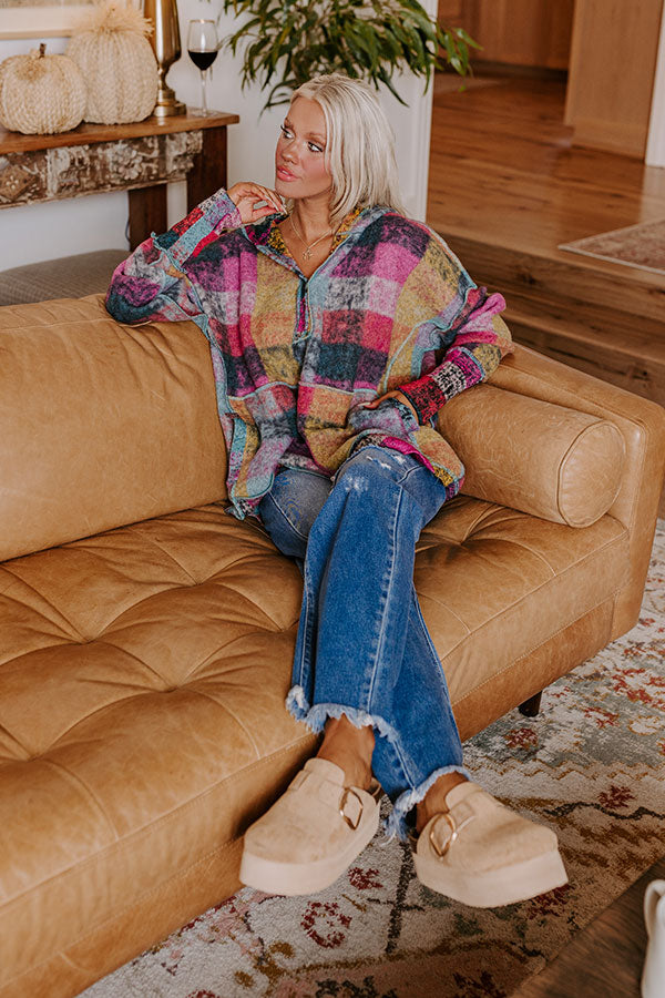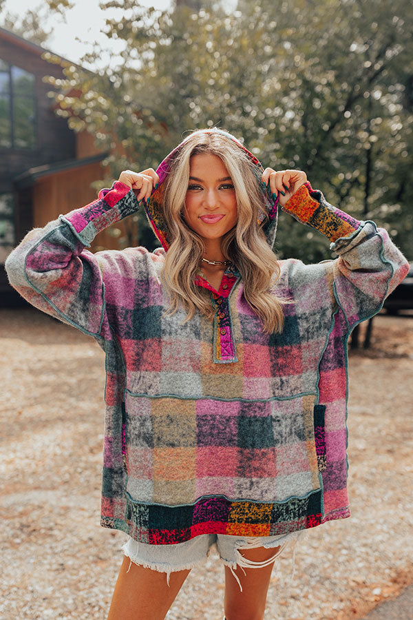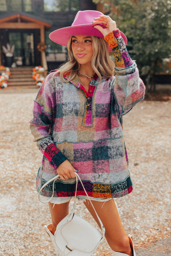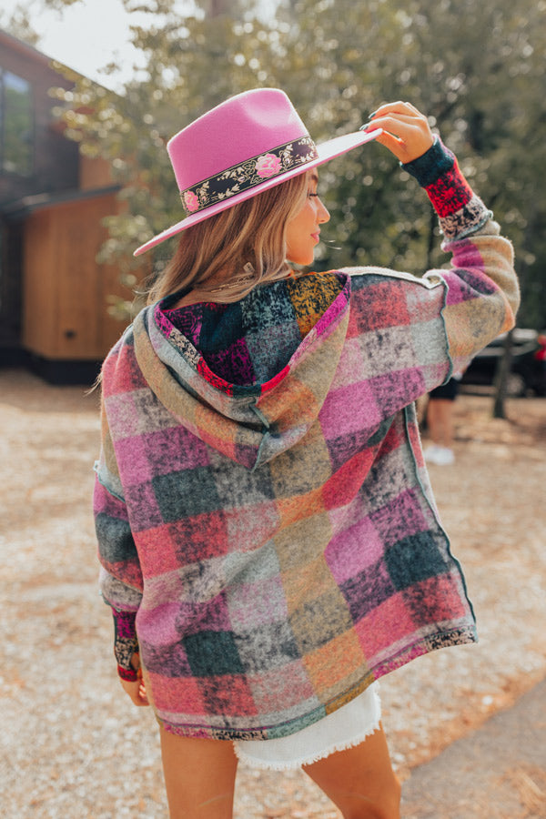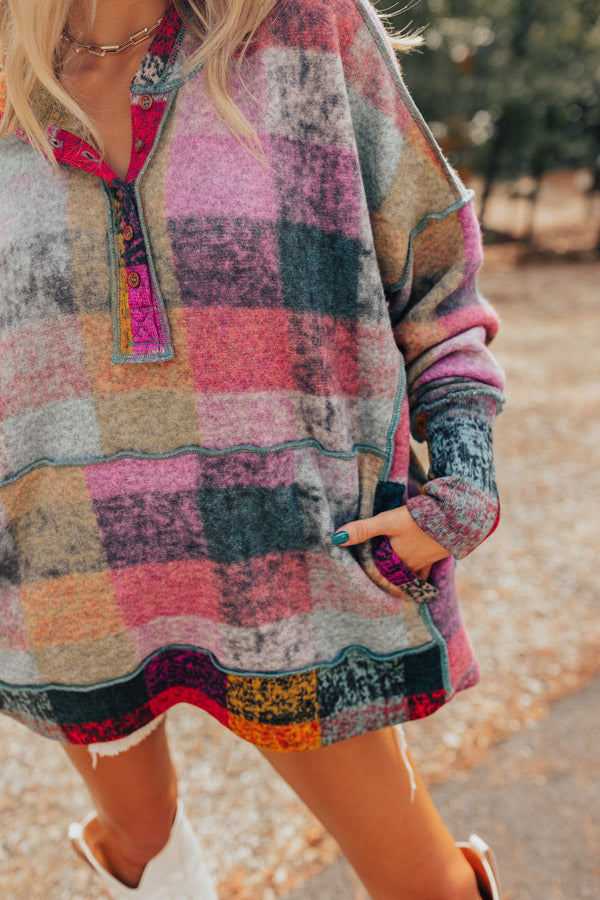 - Unlined material patterned with a fuchsia, teal, mustard, and hot plaid print
