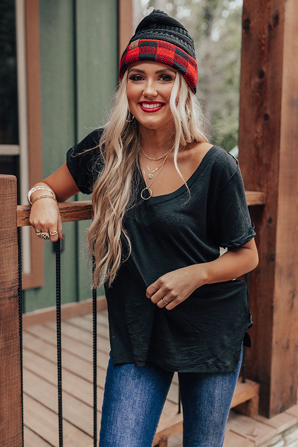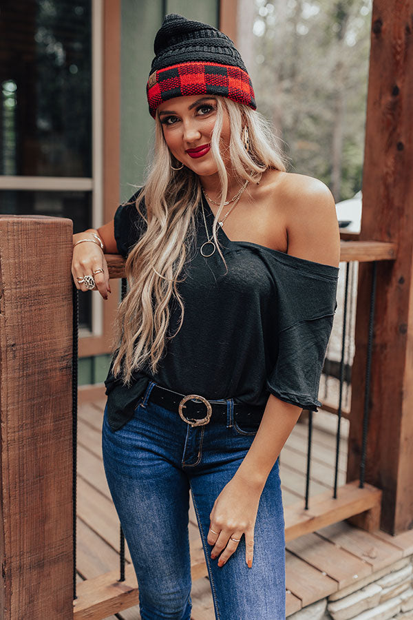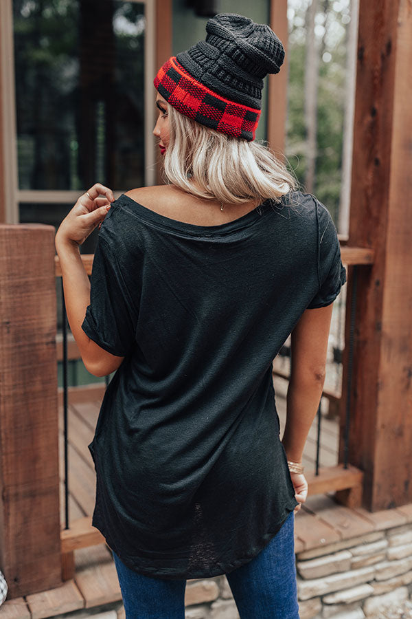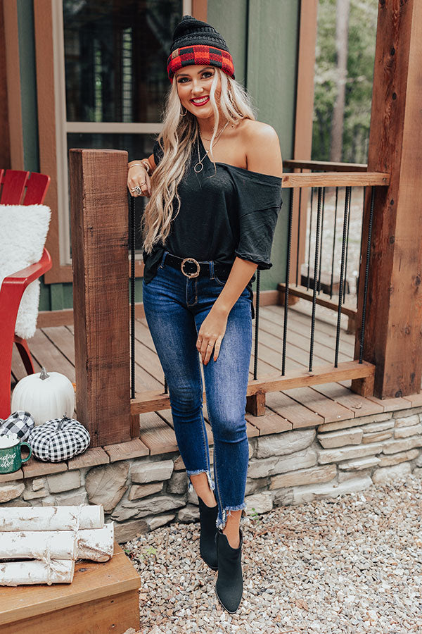 Our versatile black "Shady Grove Shift Tee" is the upgrade your fall wardrobe basics have been asking for with its lightweight material, a v-cut neckline that can be worn off one shoulder, short loose sleeves with rolled cuffs, and a relaxed silhouette that falls into a straight hemline with accent side slits! Measurements