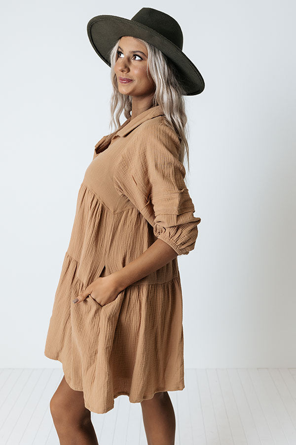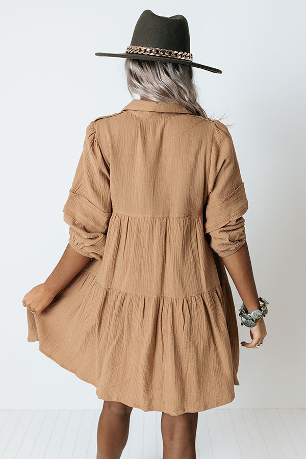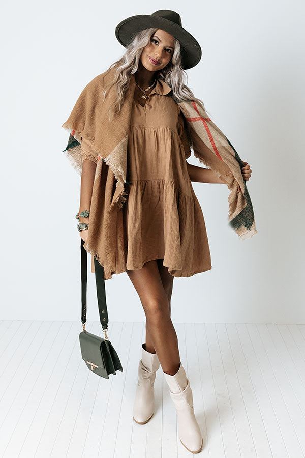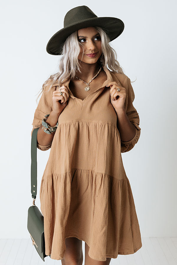 Transition into the chillier months effortlessly with our charming khaki colored 'Shape Of My Heart' dress featuring lightweight material with subtle texturing, a collared v-cut neckline, loose 3/4-length sleeves, and a relaxed tiered babydoll silhouette that falls into a straight mid-thigh length hemline!