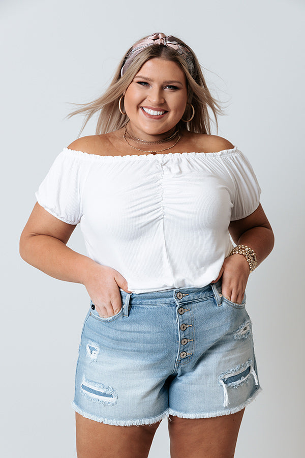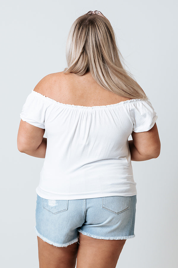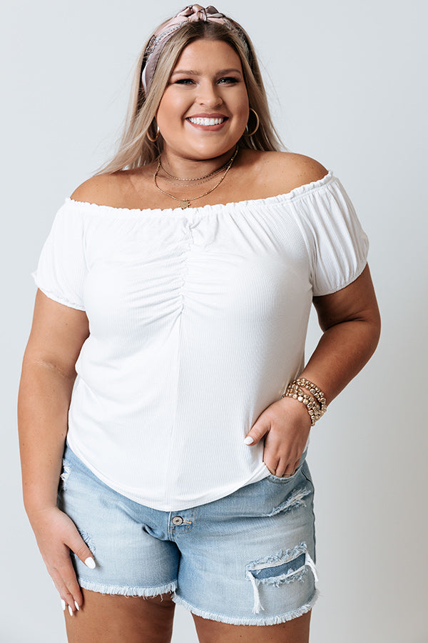 Plus Size - Look casual and cute at the same time with our adorable white 'Shape Of My Heart Top' featuring lightweight material, an off-shoulder neckline with a straight ruffle trim neckline, a cinched detail bodice with short drop sleeves, and a flattering form fitting silhouette that ends in a straight hemline! Measurements