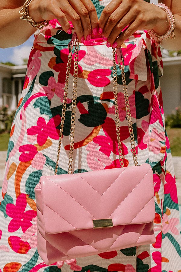 The perfect summer bag just dropped! Our adorable pink 'Share The Love' crossbody features sleek faux leather material with diagonal quilted detailing, a flap closure with a snap button, an adjustable chain link shoulder strap, and a spacious fully lined interior with additional inside pockets!