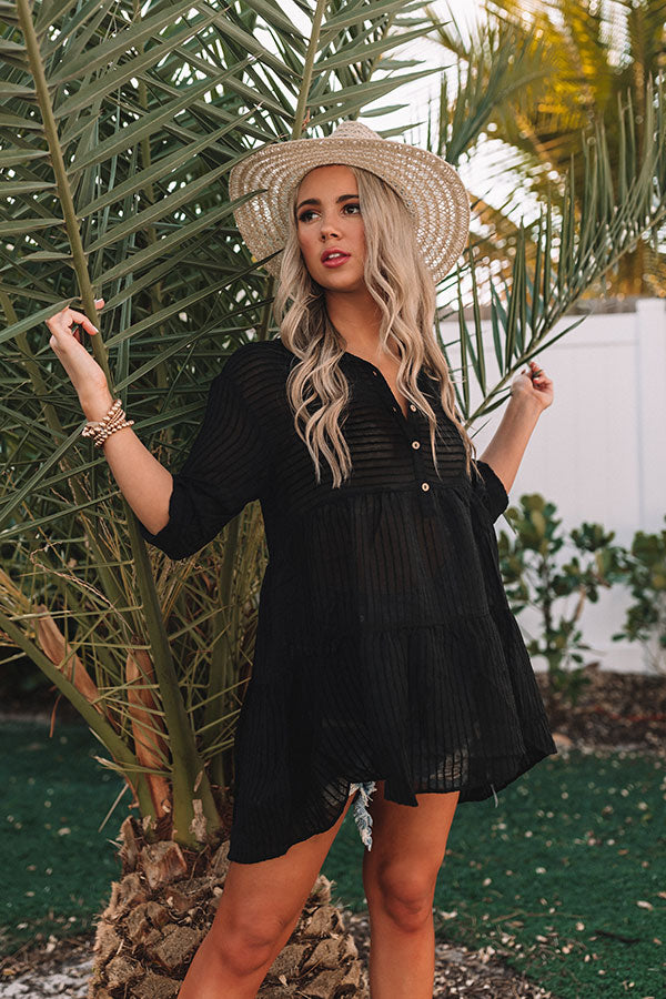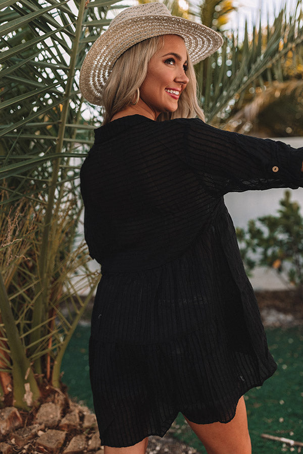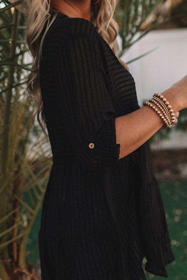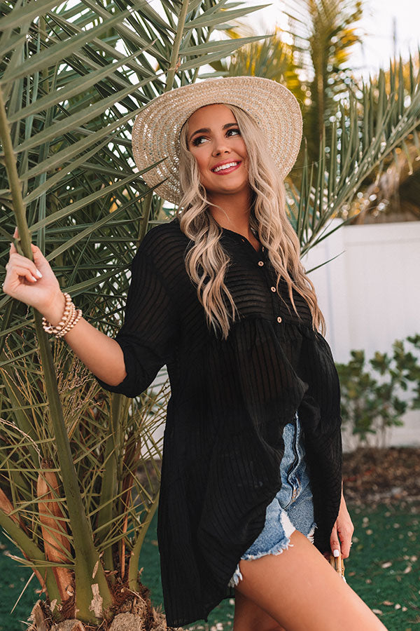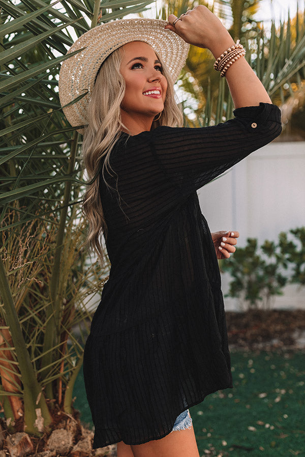 Stay looking chic all summer long in this charming black top featuring lightweight and flowy material with subtle striped detailing, a button up bodice with a rounded neckline, loose 3/4-length sleeves with roll-tab cuffs, and an ultra relaxed silhouette that falls into an uneven tunic-length hemline!