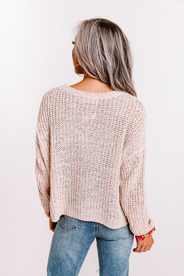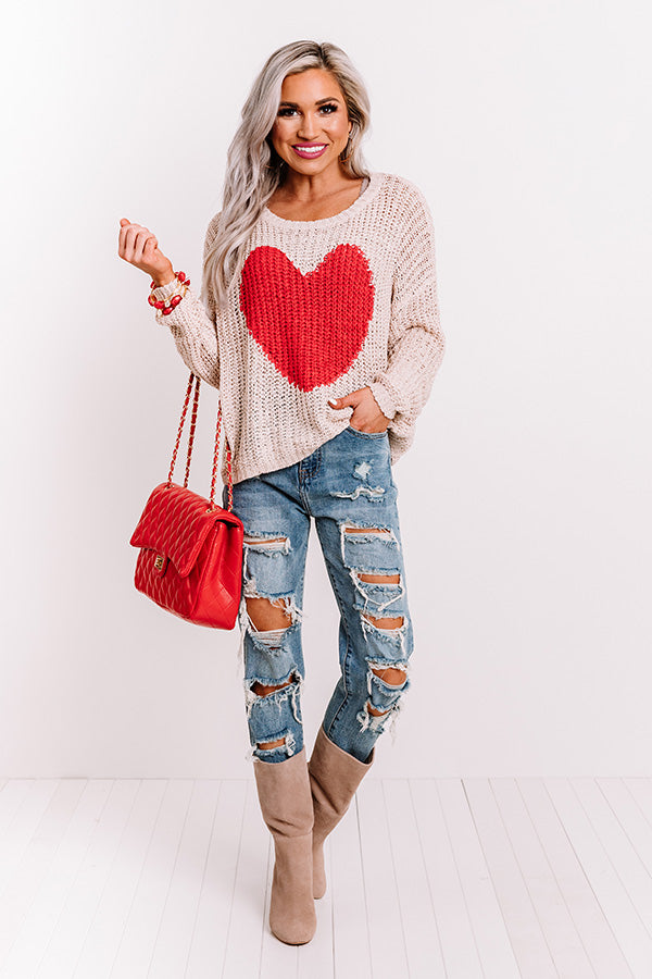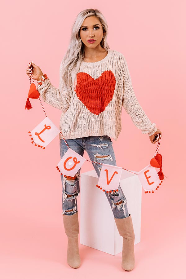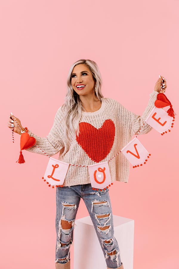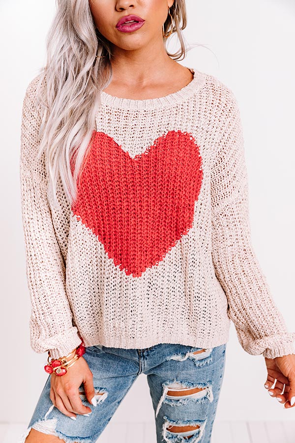 Show off your sweet side in our charming neutral hued 'She's Got Heart' sweater featuring soft lightweight loose knit material with a large red heart on the front, a high rounded neckline, long loose sleeves, and a slouched silhouette that ends in a straight hemline! Measurements