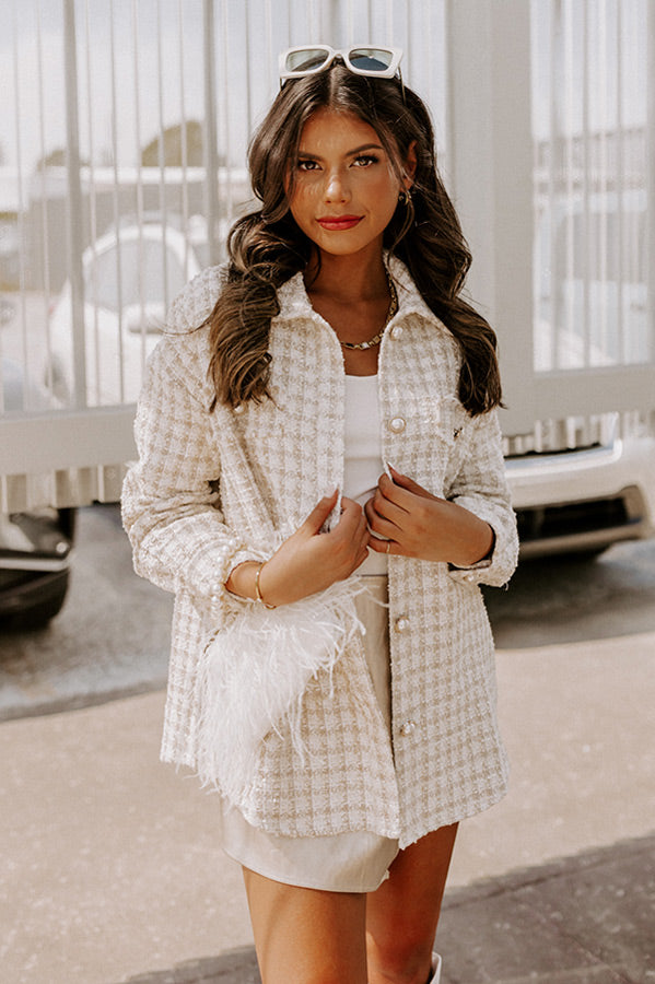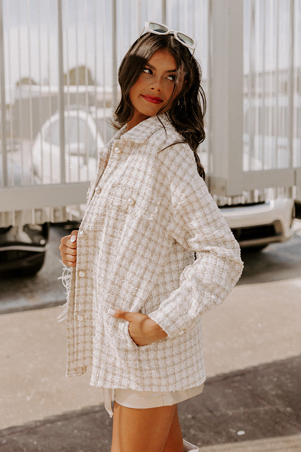 Transition into fall effortlessly with our classy ivory 'Shift Focus' jacket featuring lightweight tweed material, a pearl button down front with a collared neckline, long loose sleeves with button closure cuffs, two accent chest pocket cuts and two low pockets, and a relaxed silhouette that falls into a rounded hemline!