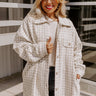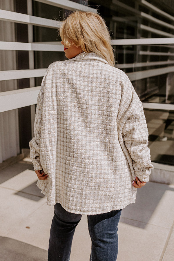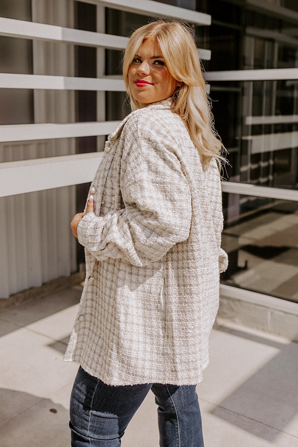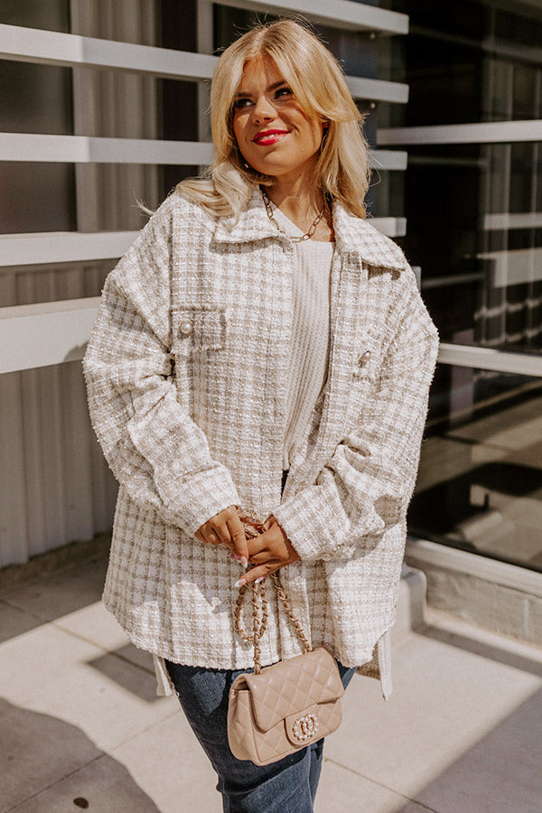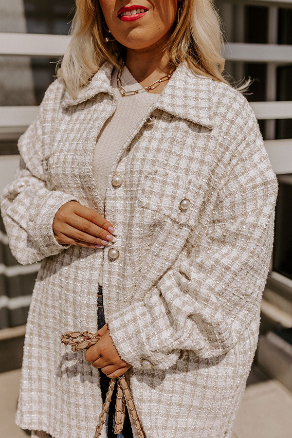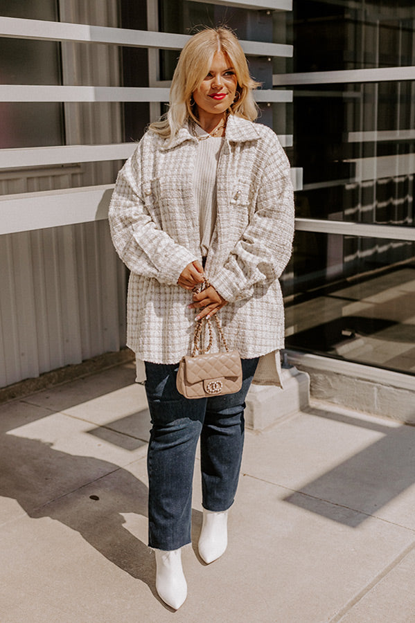 Transition into fall effortlessly with our classy ivory 'Shift Focus' jacket featuring lightweight tweed material, a pearl button down front with a collared neckline, long loose sleeves with button closure cuffs, two accent chest pocket cuts and two low pockets, and a relaxed silhouette that falls into a rounded hemline!