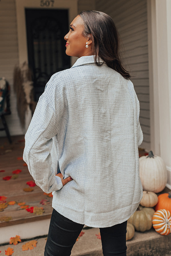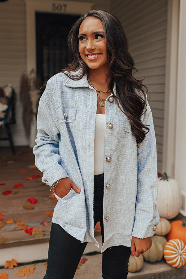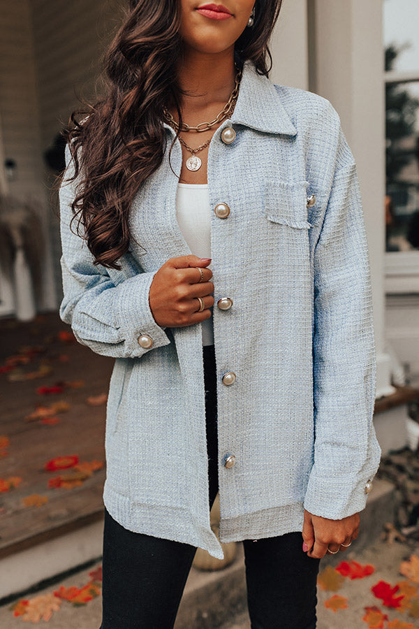 Transition into fall effortlessly with our classy light blue 'Shift Focus' jacket featuring lightweight tweed material, a pearl button down front with a collared neckline, long loose sleeves with button closure cuffs, two accent chest pocket cuts and two low pockets, and a relaxed silhouette that falls into a rounded hemline!