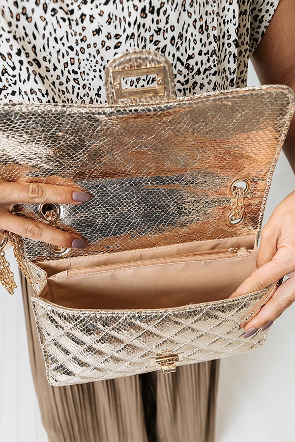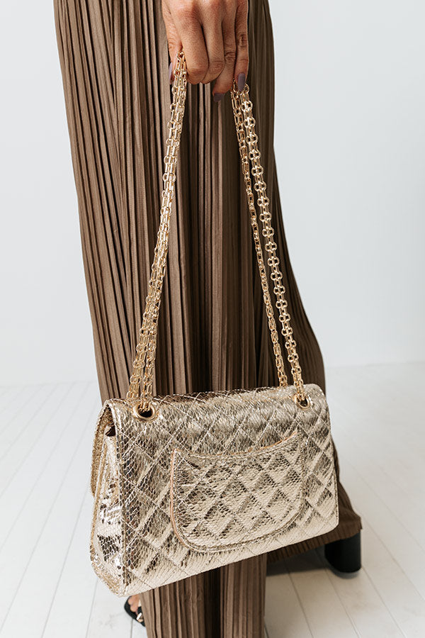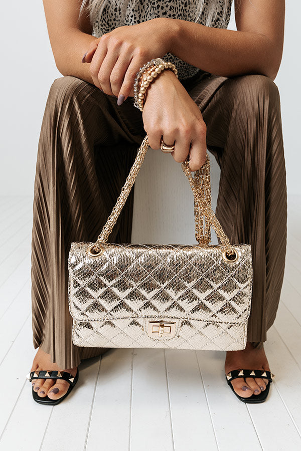 Add a little shimmer and spice to your look with this eye-catching gold purse featuring sleek quilted material, an adjustable gold chain shoulder strap, a flap closure with gold twist hardware, and a spacious rectangular silhouette with an additional zip closure pocket inside!