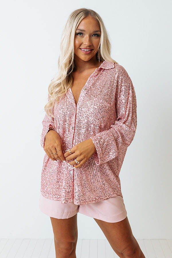 You are sure to shine bright in our eye-catching pink 'Shimmer In Your Eyes' top featuring lightweight material covered in sequins, a button down front with a collared neckline, long loose sleeves with button closure cuffs, a single accent chest pocket, and a relaxed silhouette that falls into a straight hemline!