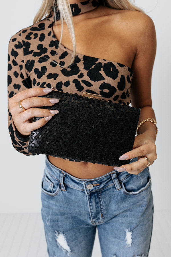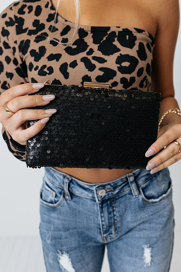 Shine on with this gorgeous clutch featuring shimmering black sequins, a removable chain link shoulder strap, and a structured rectangular box silhouette with a snap closure!