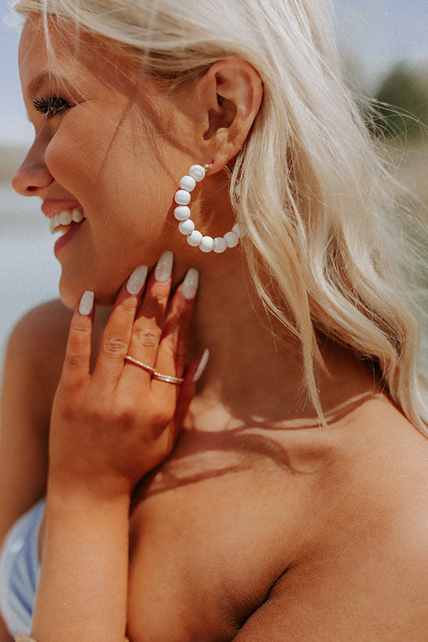 You are sure to shine bright when you accessorize with these charming earrings featuring large white beaded dangling hoops!