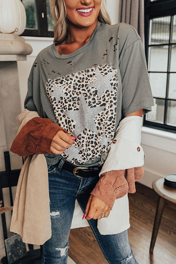You are sure to be a shining star in this cute martini olive hued tee featuring soft lightweight material with a cute leopard print and star graphic on the front, a rounded neckline with distressed detailing, long loose sleeves, and a relaxed silhouette that ends in a straight hemline! Measurements