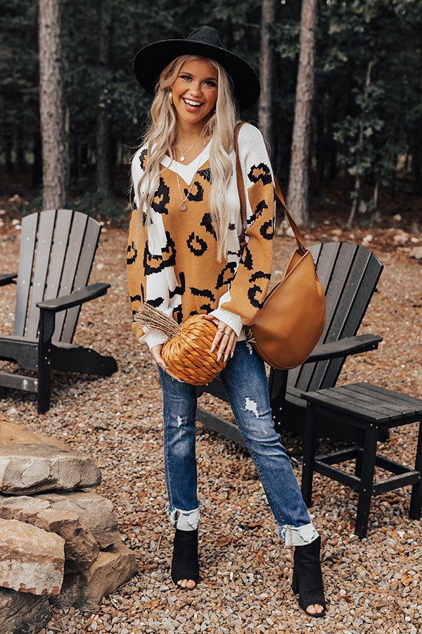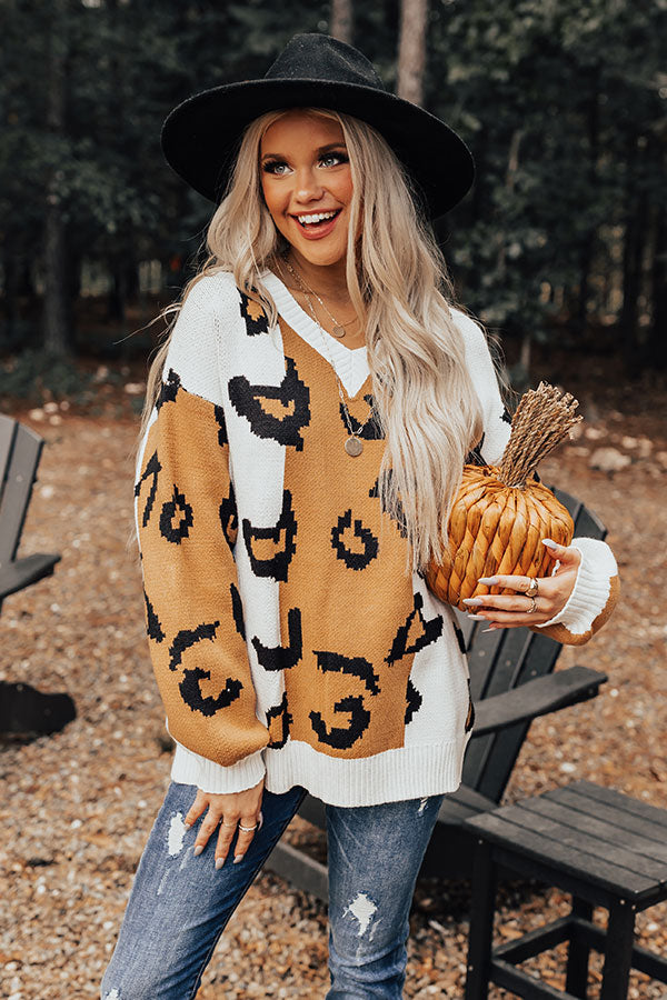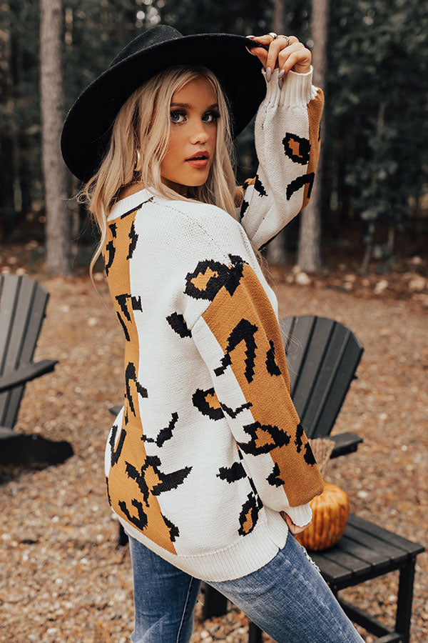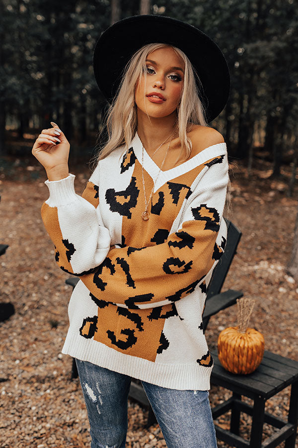 All eyes are sure to be on you in our pretty 'Shock And Delight Sweater' featuring soft knit material, white and camel hued color block panels patterned with a large black leopard print, a v-cut neckline, long loose sleeves, and a slouched silhouette that falls into a straight hemline!
