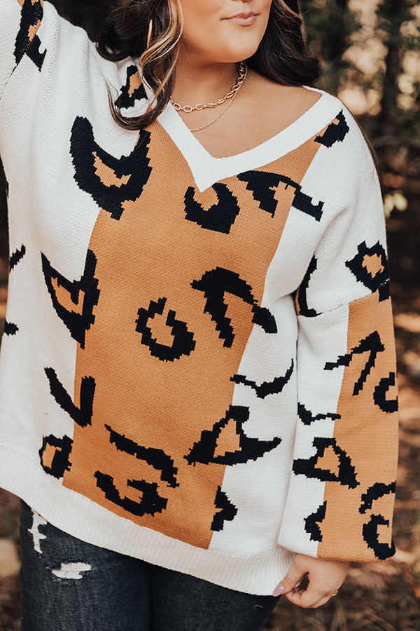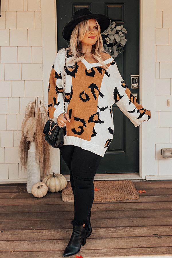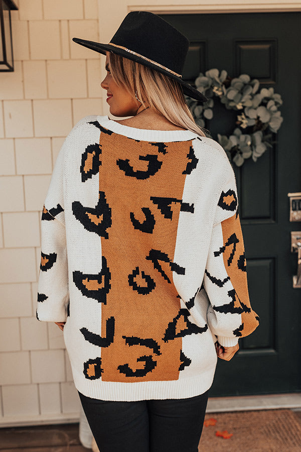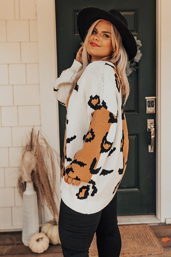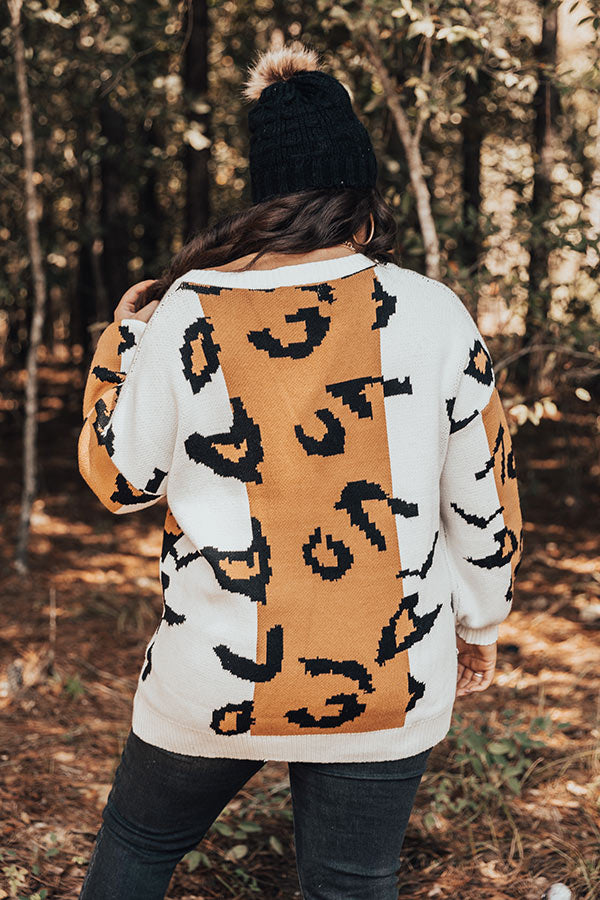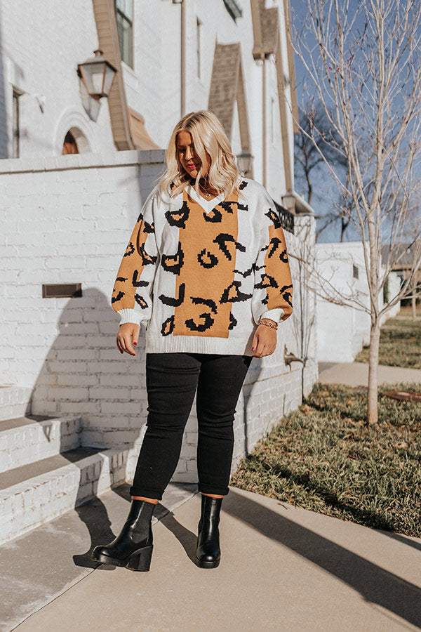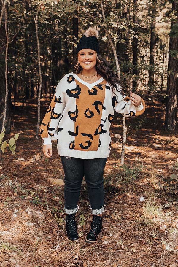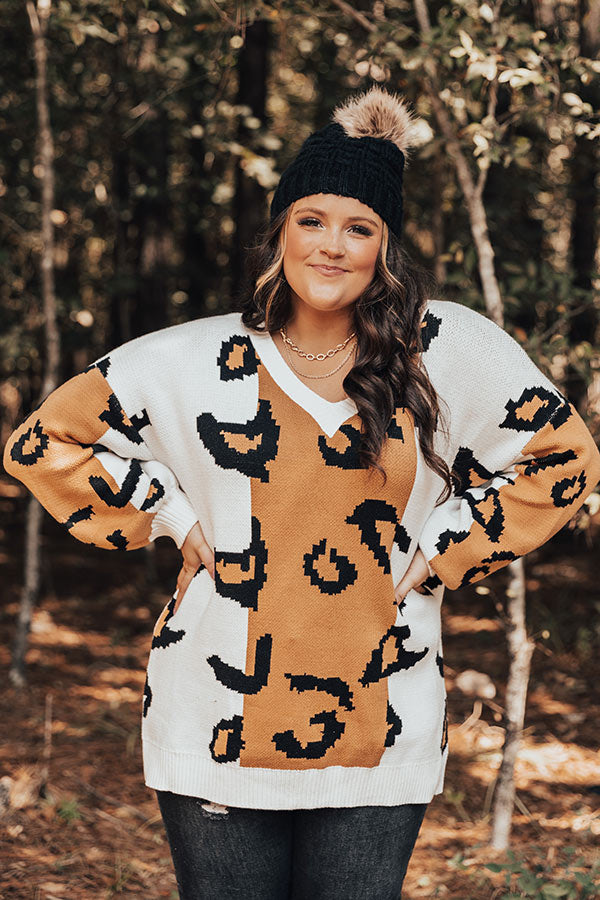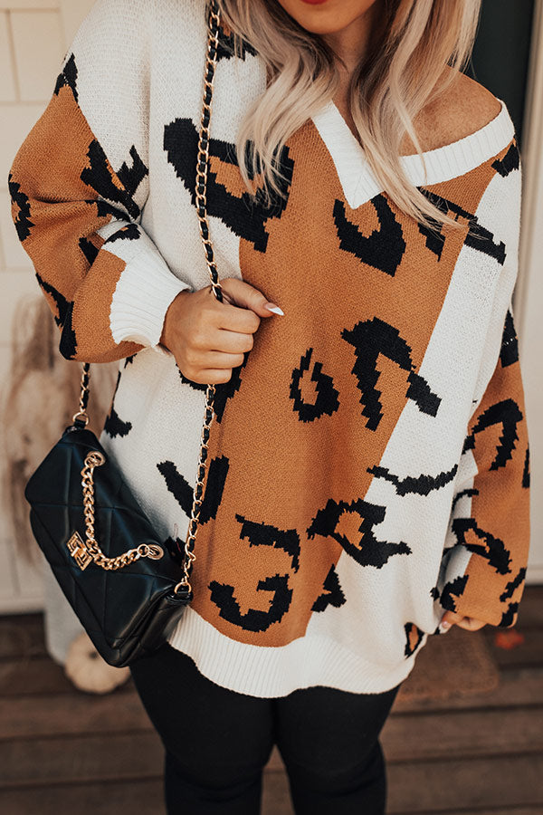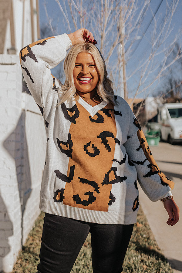 All eyes are sure to be on you in our pretty 'Shock And Delight Sweater' featuring soft knit material, white and camel hued color block panels patterned with a large black leopard print, a v-cut neckline, long loose sleeves, and a slouched silhouette that falls into a straight hemline!