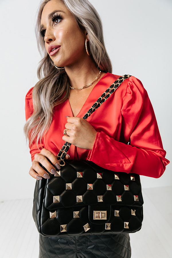 Look like you carry designer pieces when you complete your look with our black 'Shopping In Boston' tote featuring sleek faux leather material with quilted texturing and large gold studded detailing, an adjustable chain link shoulder strap, a flap closure with twist hardware, an outside back pouch, and a spacious fully lined interior with an additional inside pocket!