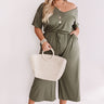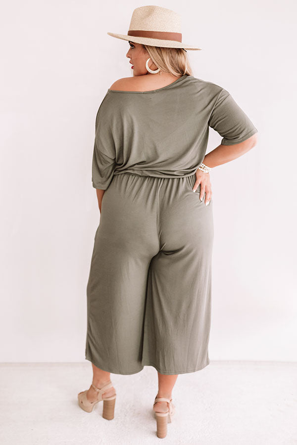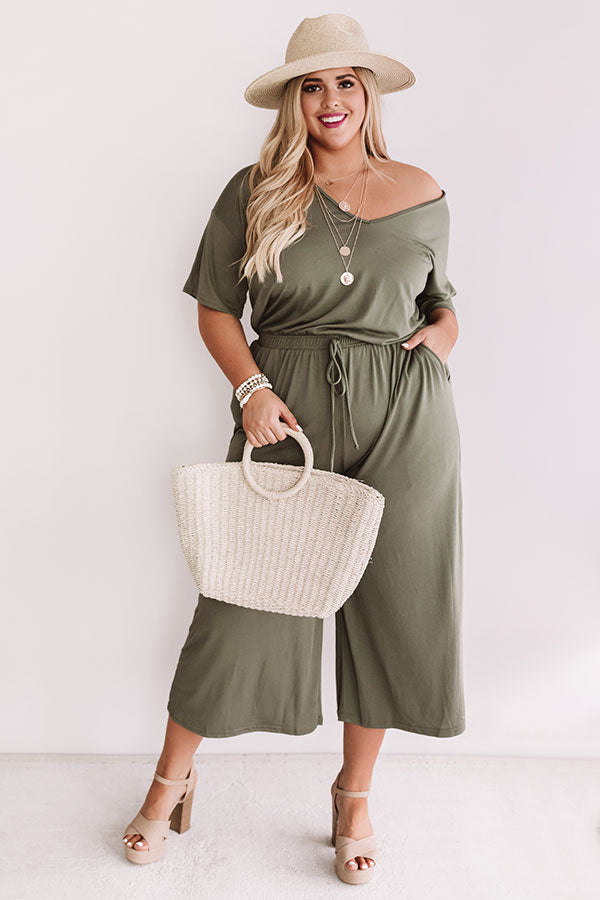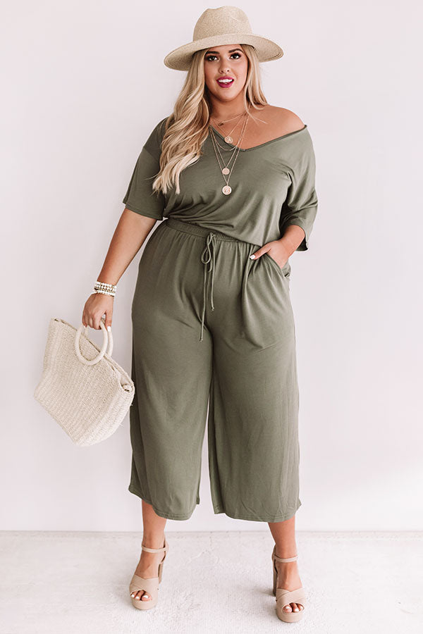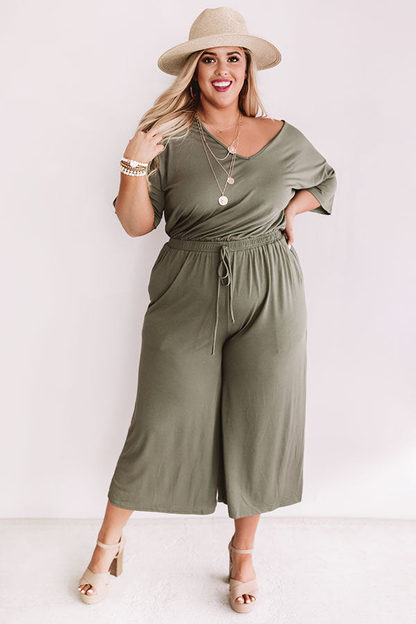 Plus Size - You will look like quite the shopping fashionista in this chardonnay jumpsuit with its wide v-neck that can be worn to one side, front pockets, calf length breezy pants, and elastic waistband with a tie belt! This earthy piece can be styled with a neutral pallet or you can go bold with leopard accessories like "The Livvy Leopard Espadrille Sneaker" or our "Tahoe Bound Backpack in Black!" Measurements