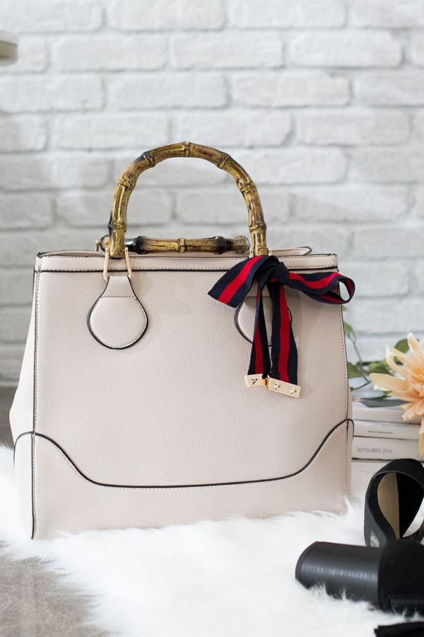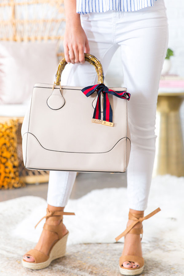 Faux leather tote with bamboo handles & a striped ribbon tie around the front handle.