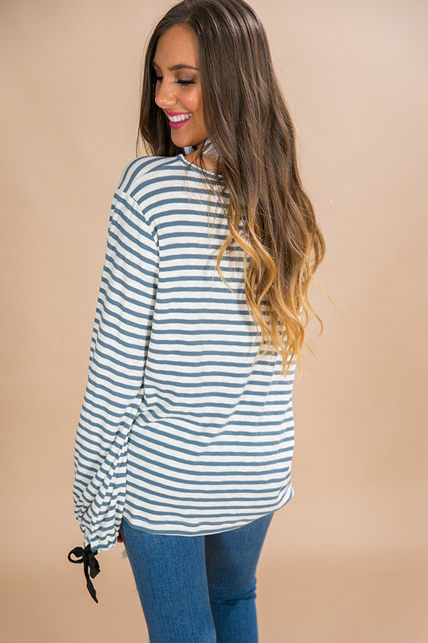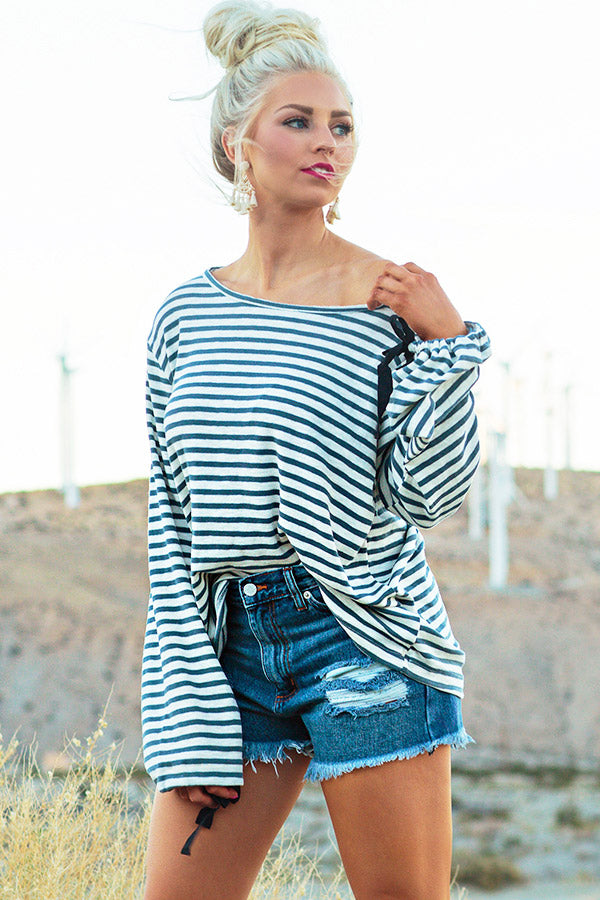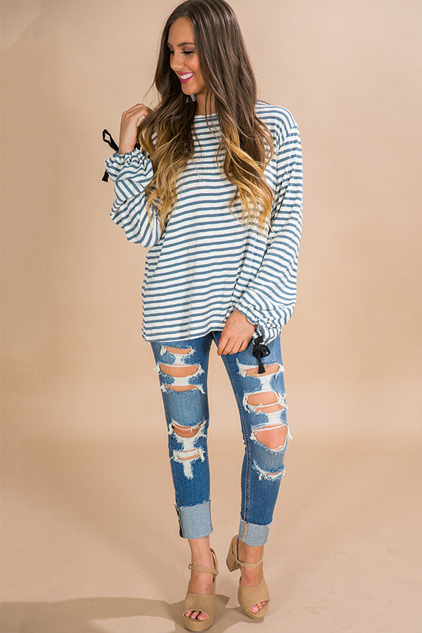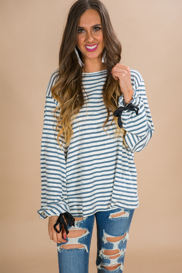 This striped knit top is a shore thing! With a relaxed silhouette and a lightweight long sleeve with chic tying cuffs... Comfortably cute has never looked so good!