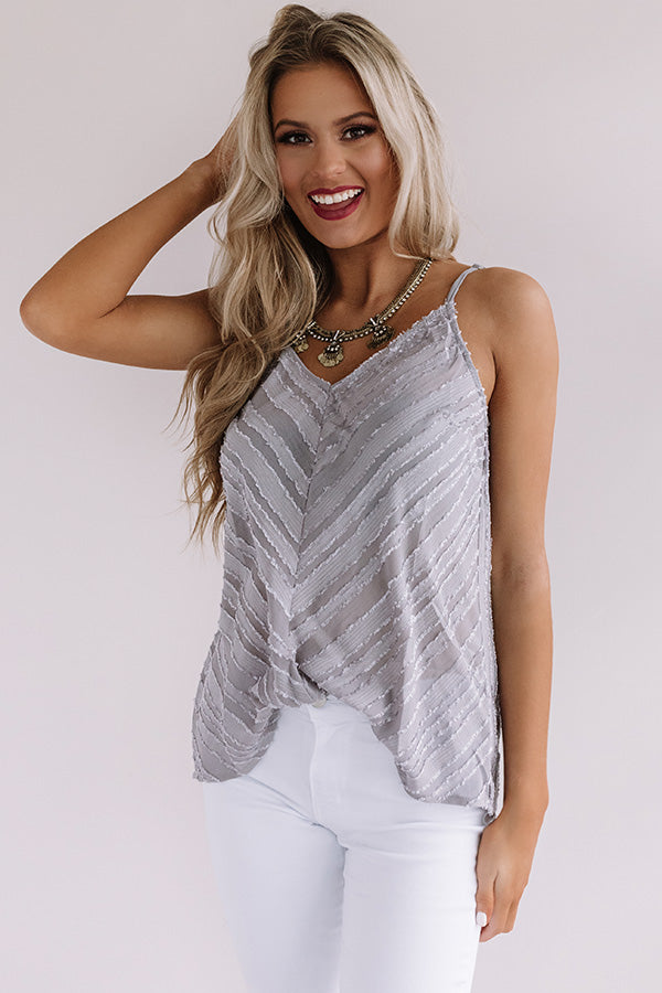 Our dainty grey "Shoreline Views Shift Tank" features ultra lightweight material patterned with a large chevron print, subtle texturing, adjustable spaghetti straps with a v-cut neckline and upper back, and a relaxed silhouette that falls into a rounded hemline! We have styled this upscale basic with some distressed white flares and espadrille sandals, but you can also wear it layered under our "Blissful Brunch Colorblock Cardigan" with some frayed denim shorts, "The Brighton Espadrille in Black," our "All Caught Up Headband in Ivory!" Measurements