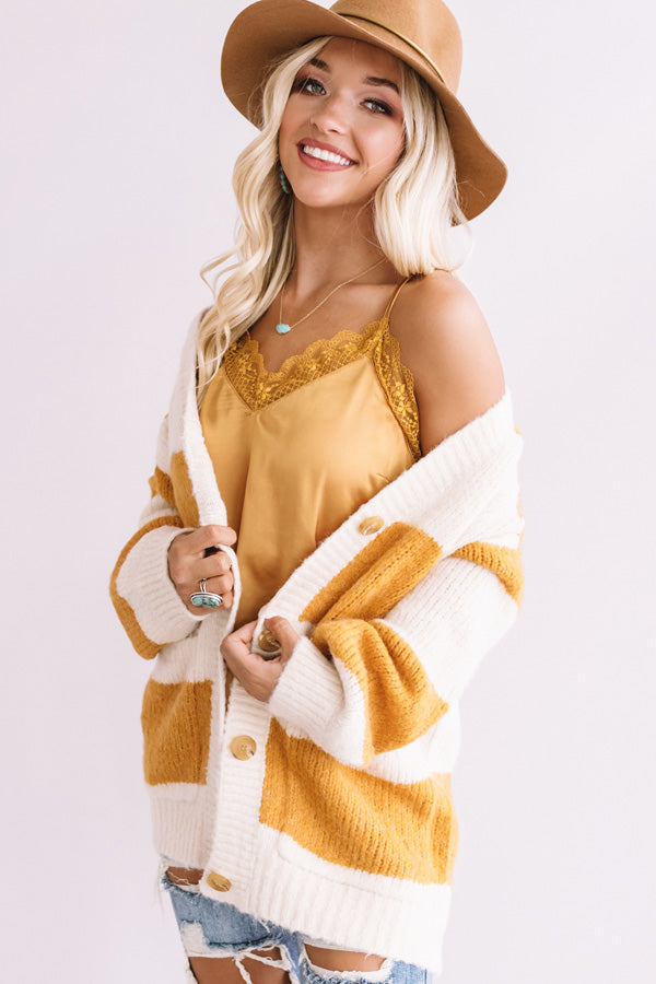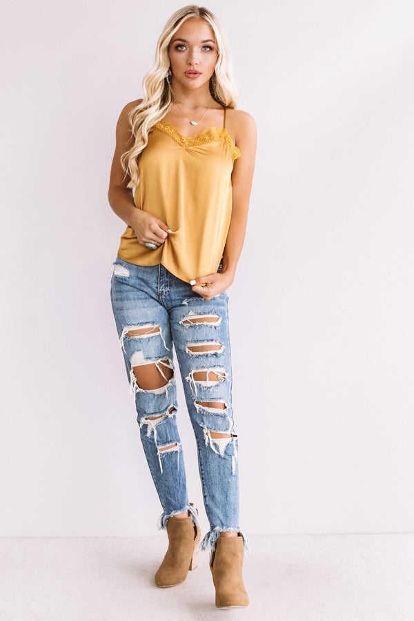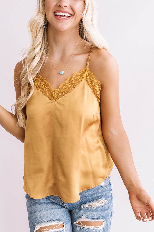 We think you will love the look of this mustard colored tank so much that you will always want to "show it off" It features a v-cut neckline with lace trim detailing, lightweight sating material, adjustable criss-crossed spaghetti straps, and relaxed bodice that falls into a straight hemline! We have styled it with some distressed ankle skinnies and a neutral bootie, but you can also wear it under our "Better With Vino Cardigan in Grey" with some black flares, "The Seraphina Faux Leather Wedge in Grey," and our "All Caught Up Headband in Grey!" Measurements