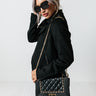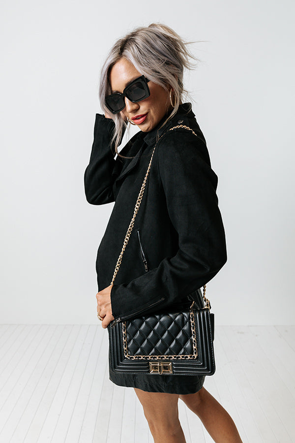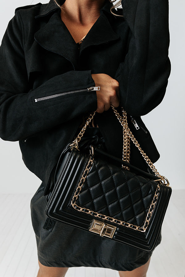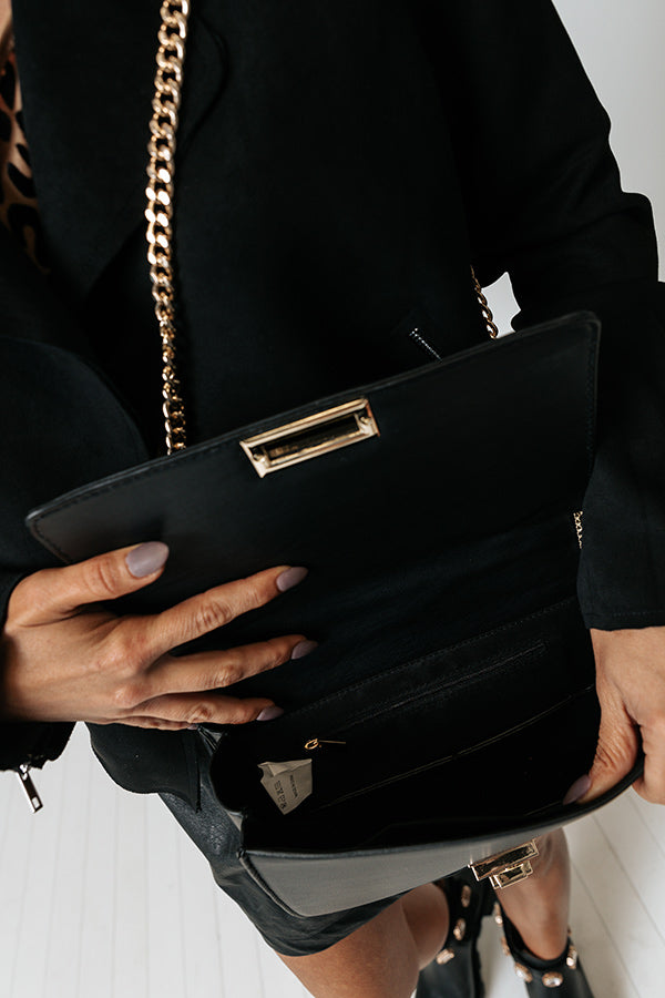 Elevate your look easily with our chic black 'Show Love' crossbody featuring faux leather material with quilted texturing, a chain link shoulder strap, a single handle, a flap closure with gold twist hardware, and a spacious structured rectangular silhouette with an additional inside pocket!