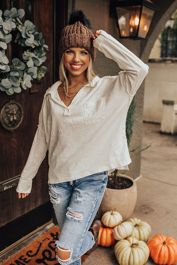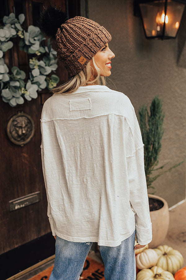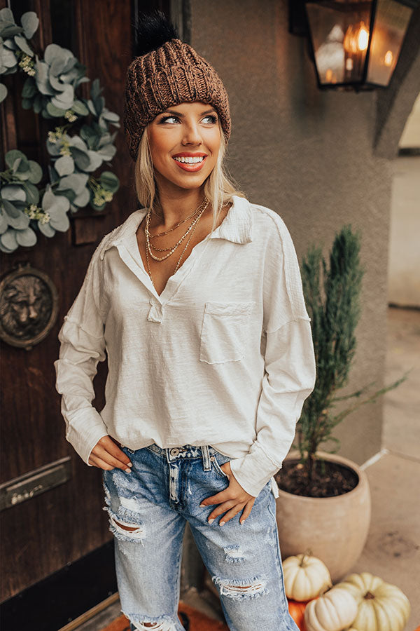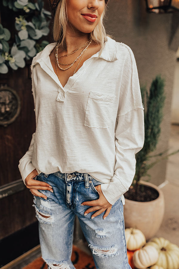 Keep your look simple but stylish with our casual white 'Show Notes Shift Top' featuring soft lightweight material, a collared v-cut neckline, long loose sleeves, a single accent chest pocket, exposed seam detailing, and a relaxed silhouette that falls into a straight hemline with side slits! Measurements