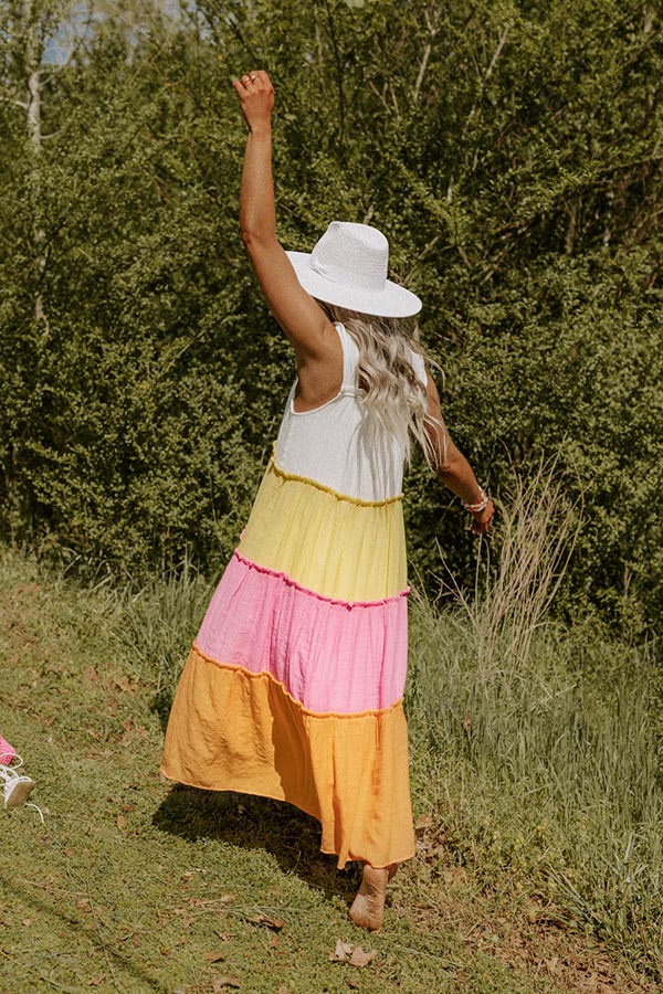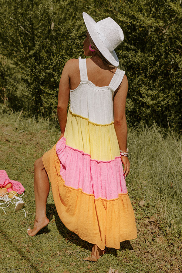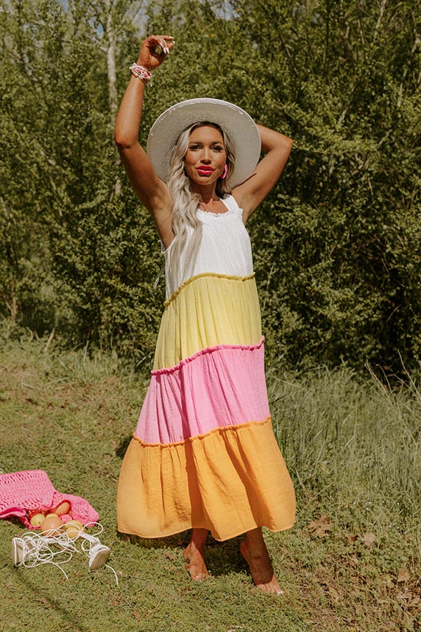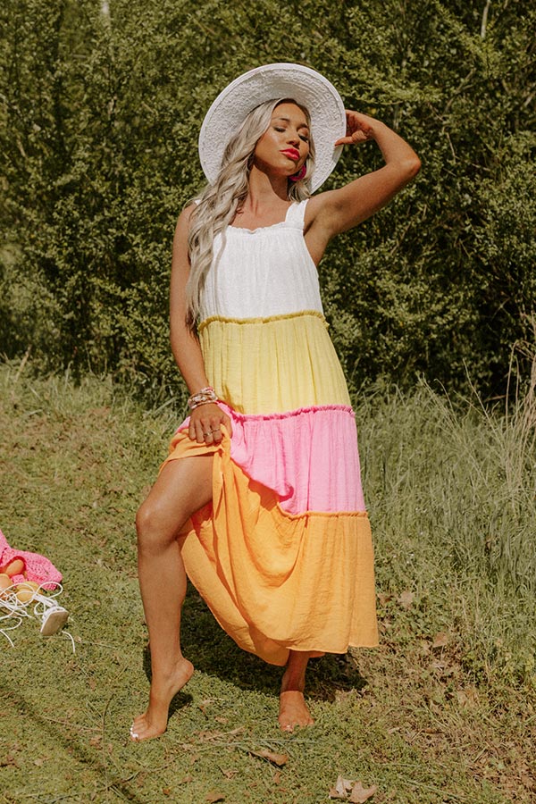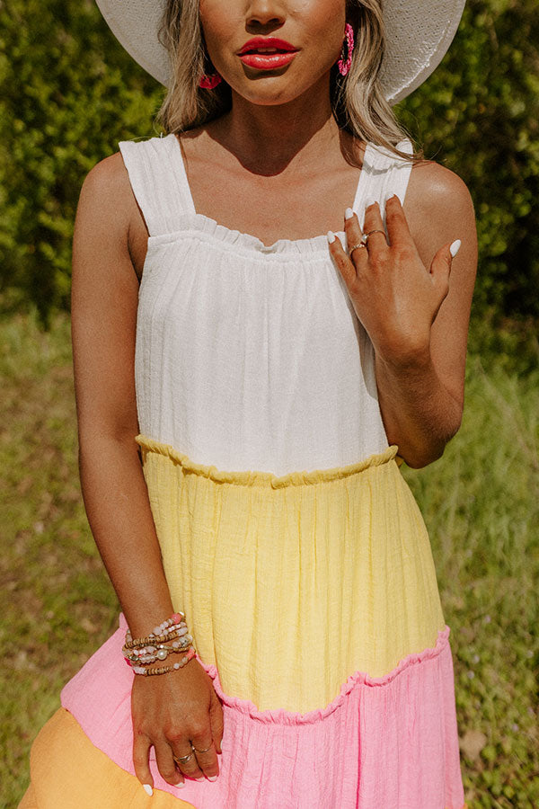 Get ready for summer effortlessly in our beautiful 'Show You Around Midi' dress featuring lightweight material with white, yellow, pink, and light orange color block panels, a square neckline and upper back, wide sleeveless shoulder straps, and a draped silhouette that cascades into a straight mid-calf length hemline! on products