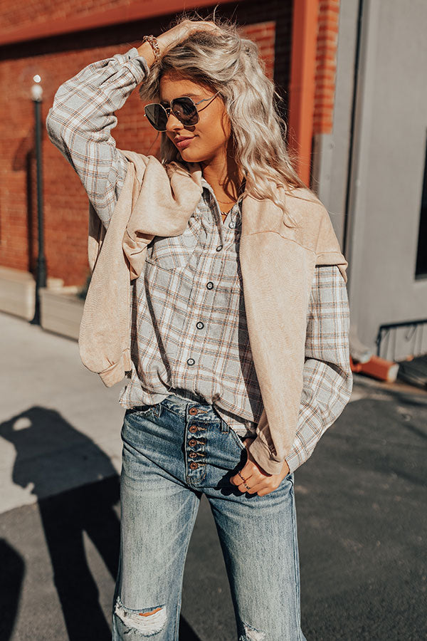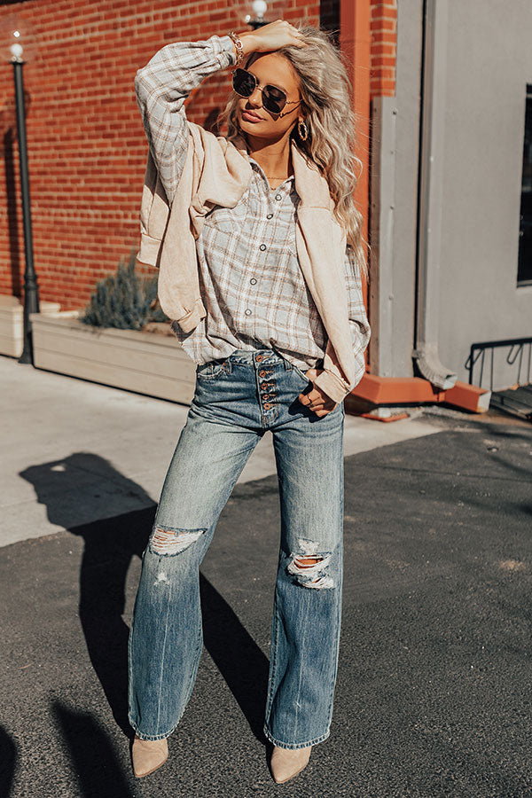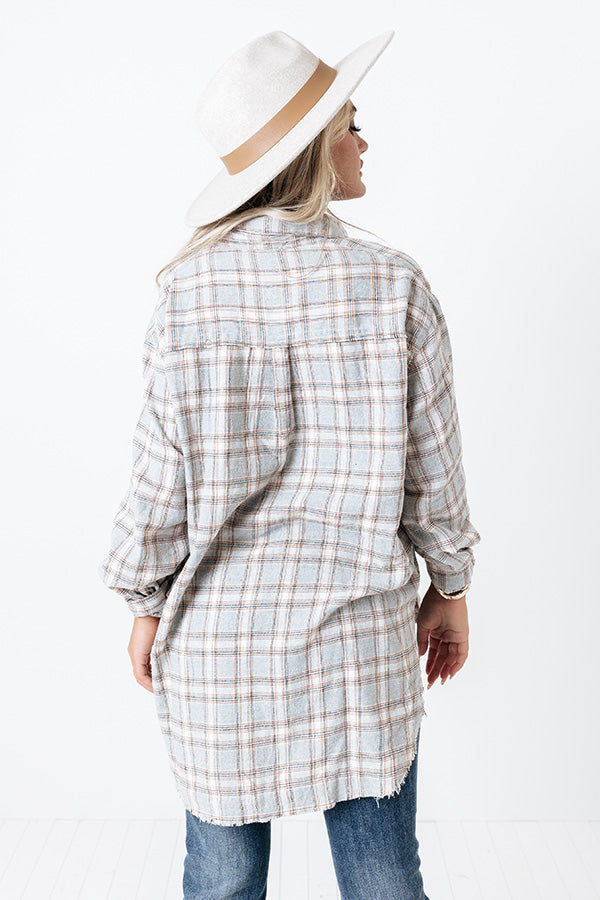 Transition from season to season effortlessly with our casual light blue hued 'Show Your Heart' top featuring lightweight material pattered with a white and natural hued plaid print, a button up front with a collared neckline, long loose sleeves with button closure cuffs, two front chest pockets, and a relaxed silhouette that falls into a rounded hemline! Measurements
