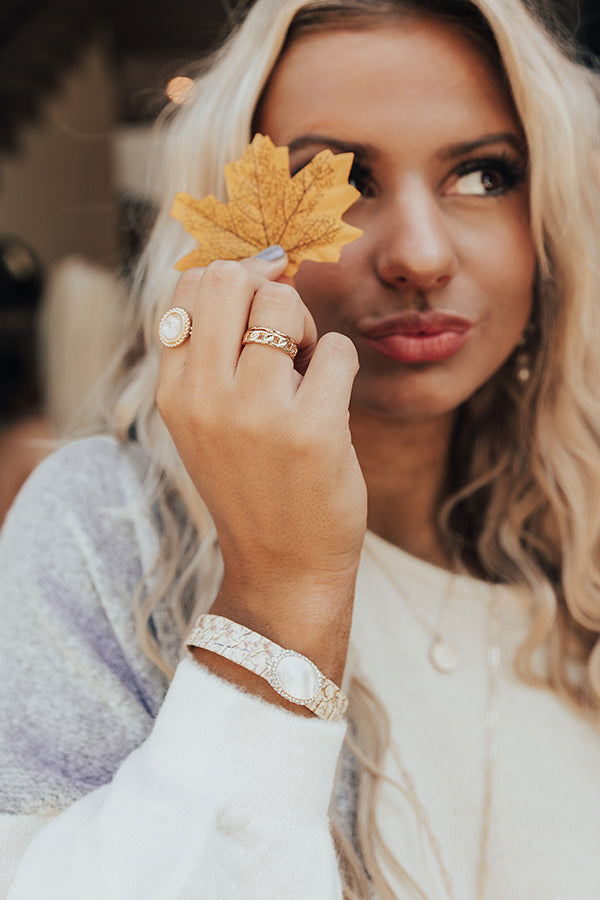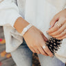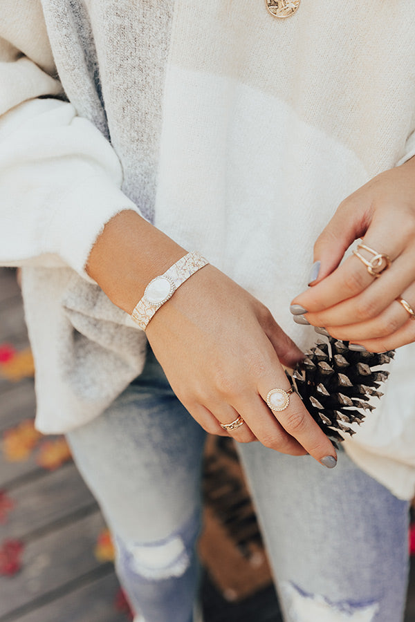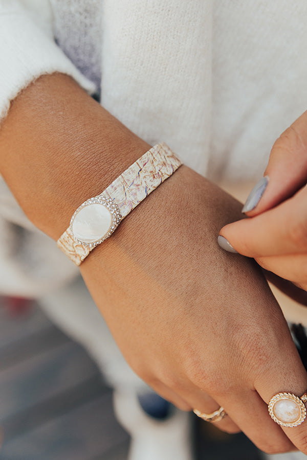 People are sure to shower you with compliments when you add this lovely bracelet to your arm candy stack with its snake print band and white druzy stone accent!