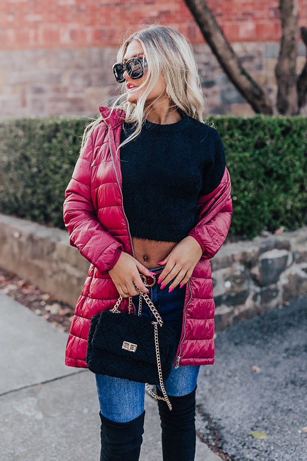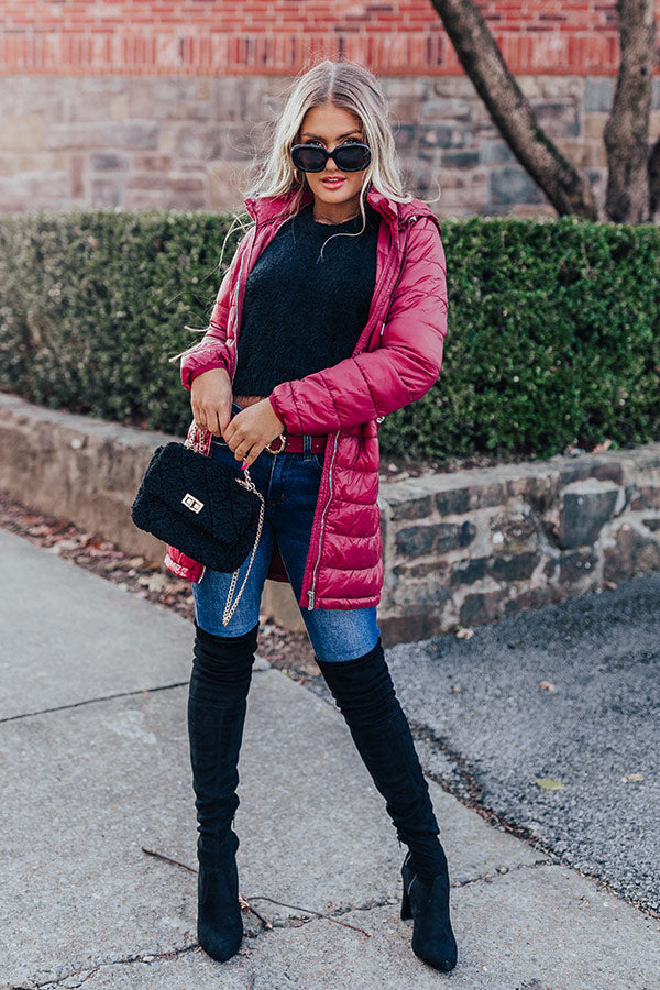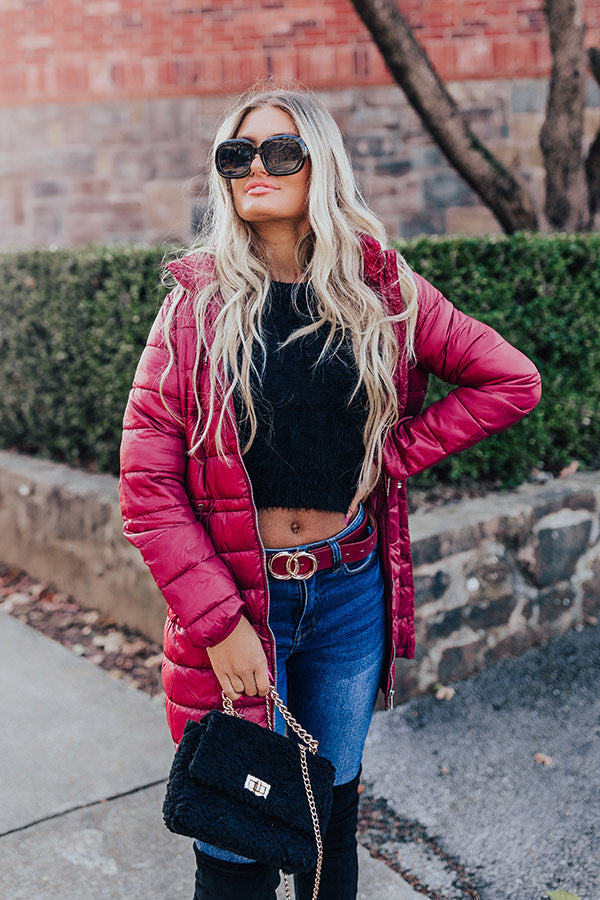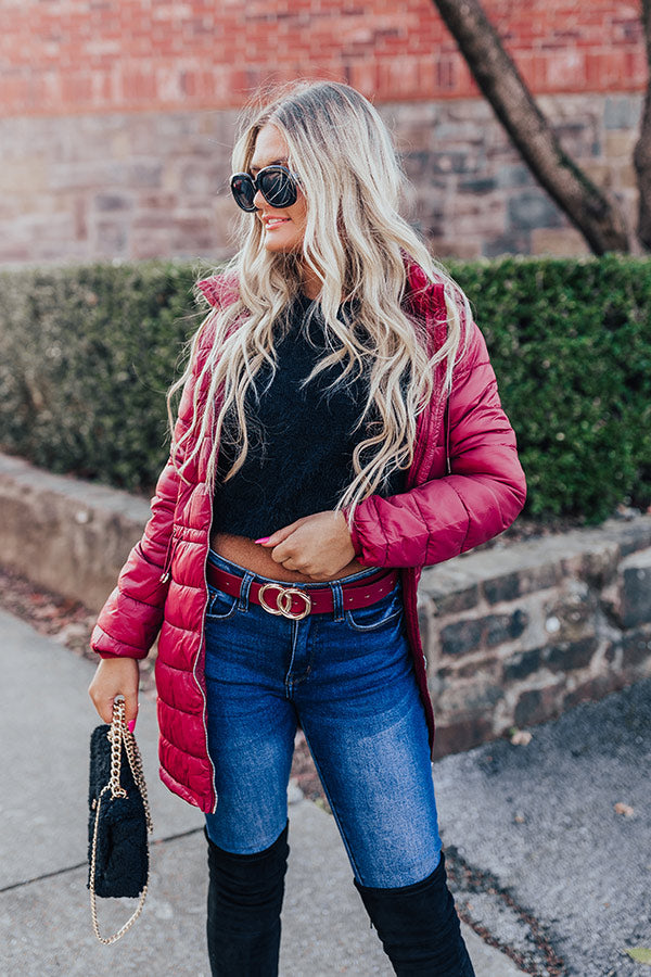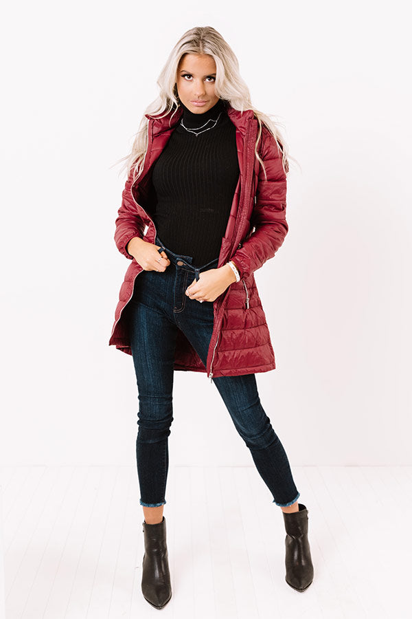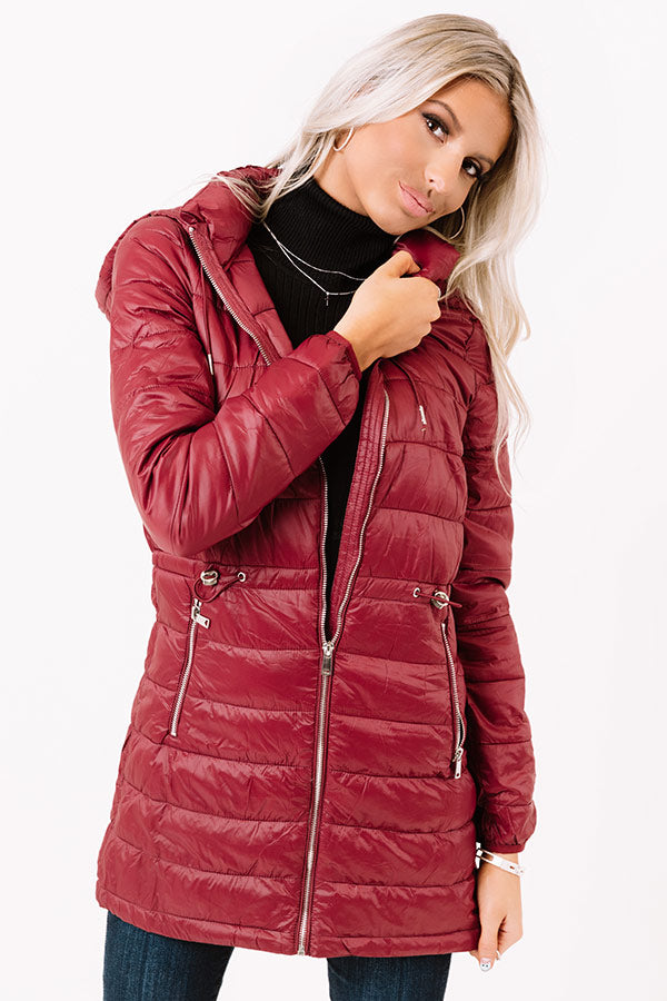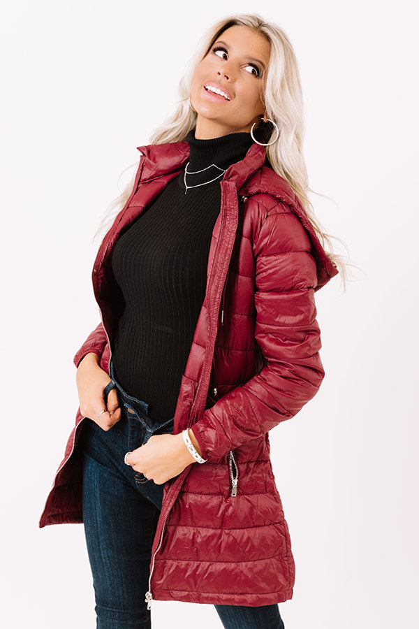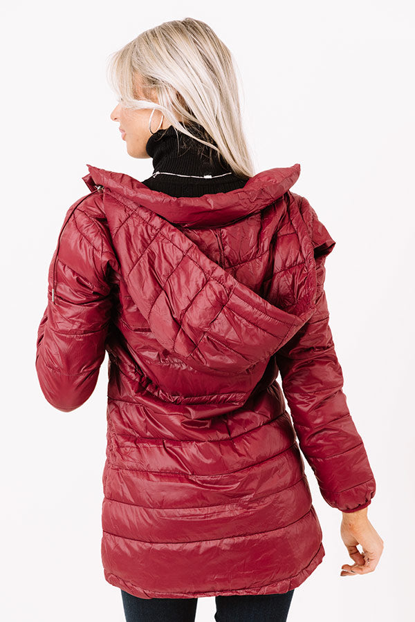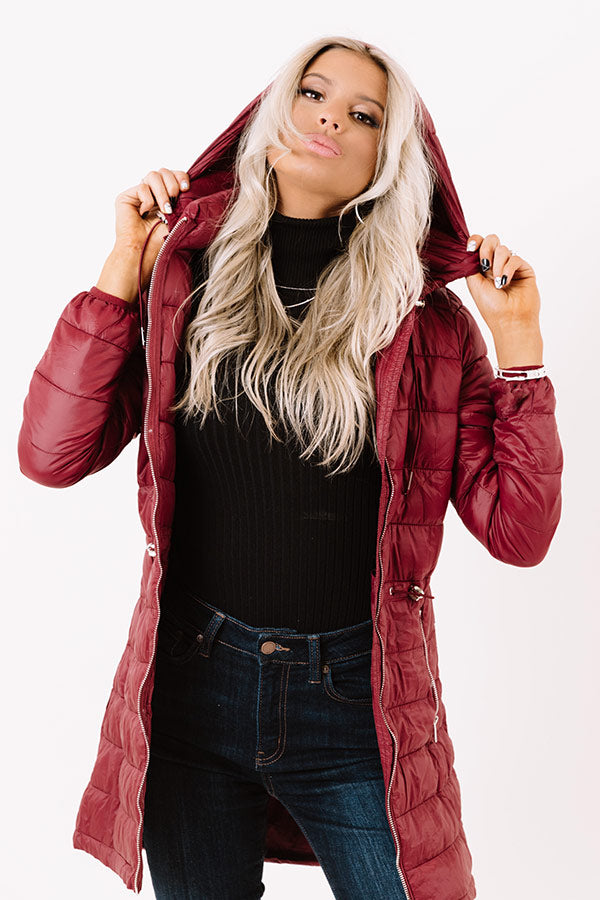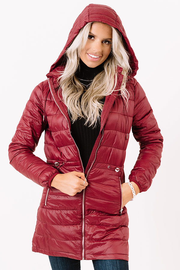 Turn heads in our timeless wine colored 'Shuttle To The City Jacket' featuring lightweight horizontally quilted material, long loose sleeves with elastic band cuffs, a zip front with a collared neckline and a removable hooded back, low accent side pockets with zip closures, a cinched waistline, and a flattering silhouette that falls into a straight upper-thigh length hemline!