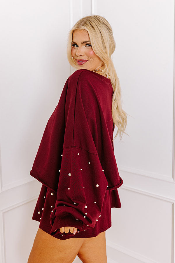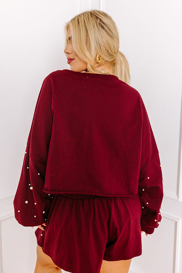 Sideline Chic Pearl Embellished Crop Sweatshirt in Maroon Curves