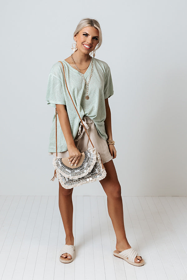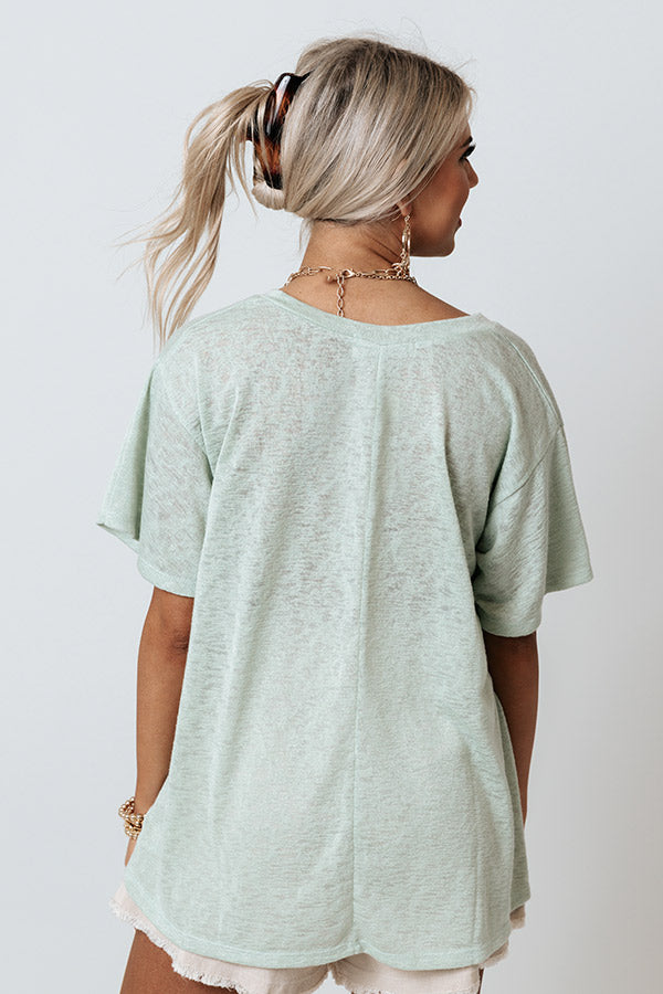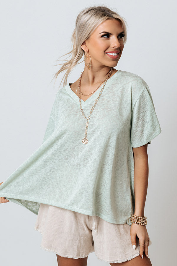 Enjoy brunch in style at a sidewalk cafe in this casual mint colored shift tee featuring soft lightweight flowy material, a v-cut neckline, short loose sleeves, and a slouched silhouette that falls into a rounded hemline! Measurements