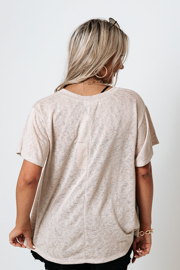Enjoy brunch in style at a sidewalk cafe in this casual warm taupe colored shift tee featuring soft lightweight flowy material, a v-cut neckline, short loose sleeves, and a slouched silhouette that falls into a rounded hemline!