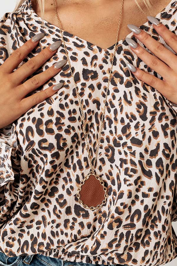 Accessorize with ease by draping our pretty 'Sierra Nevada Necklace' around your neck with its long dainty gold chain and large cinnamon hued teardrop pendant in a chain link setting!