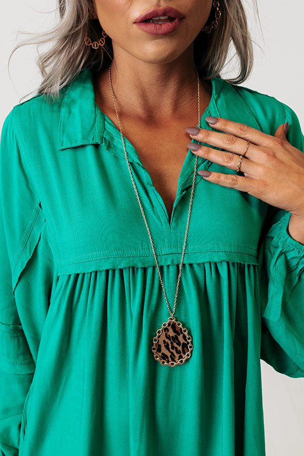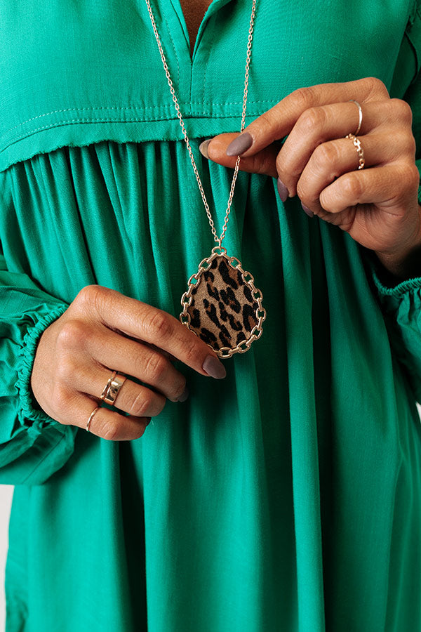 Accessorize with ease by draping our pretty 'Sierra Nevada Necklace' around your neck with its long dainty gold chain and large leopard print teardrop pendant in a chain link setting!