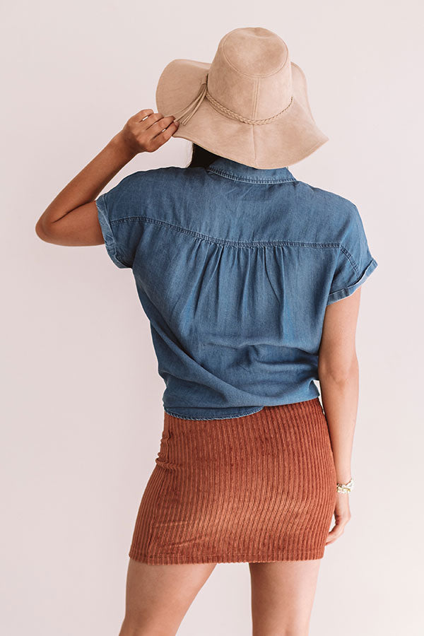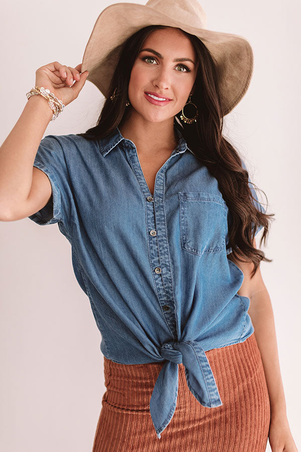 We have officially died and reached neutral nirvana! This chambray cutie has a collared neckline, short cuffed sleeves, a button down bodice with front accent bottom, and a trendy tie bottom hem! Style this classic babe with your favorite white denim for a timeless look that you will wear time and time again!