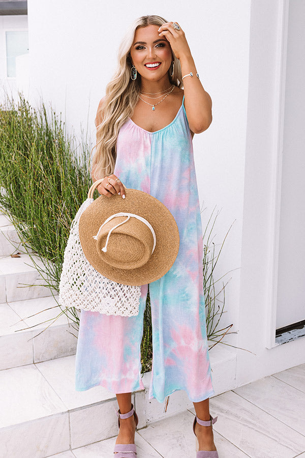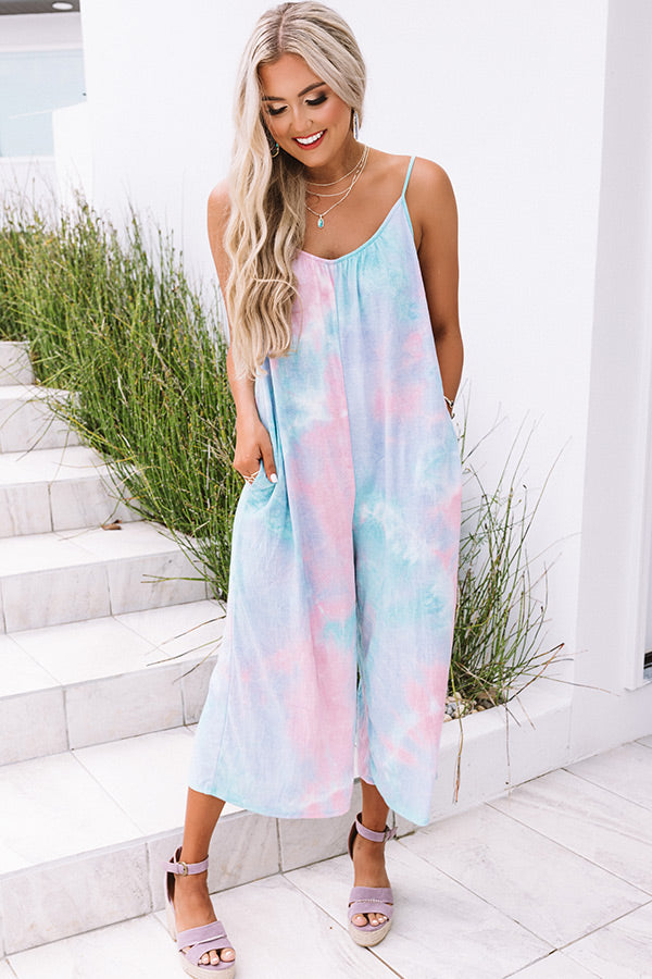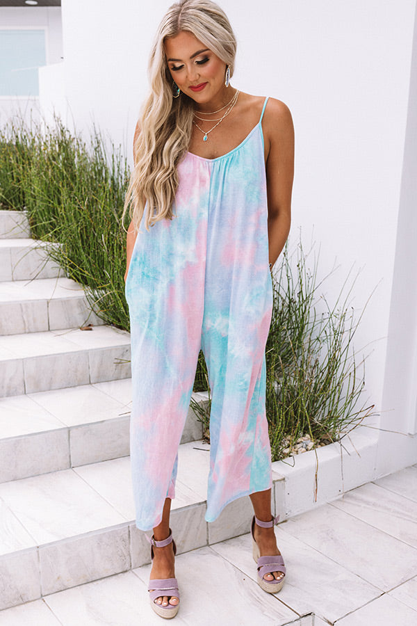 You will surely live a vibrant summer in our darling "Sights On The Sea" jumpsuit featuring lightweight breezy material patterned with blue and pink/purple hued tie due, a wide v-cut neckline and low open back, adjustable spaghetti straps, accent side pockets, and an ultra relaxed silhouette that falls into straight mid-calf length hemlines! You can style this cutie a variety of ways, like with a matching block heel and a woven hat and net bag, but you can also wear it with "The Bowen Wedge in Blush" and our "Sippin' In The Shade Sunnies in Blush!" Measurements