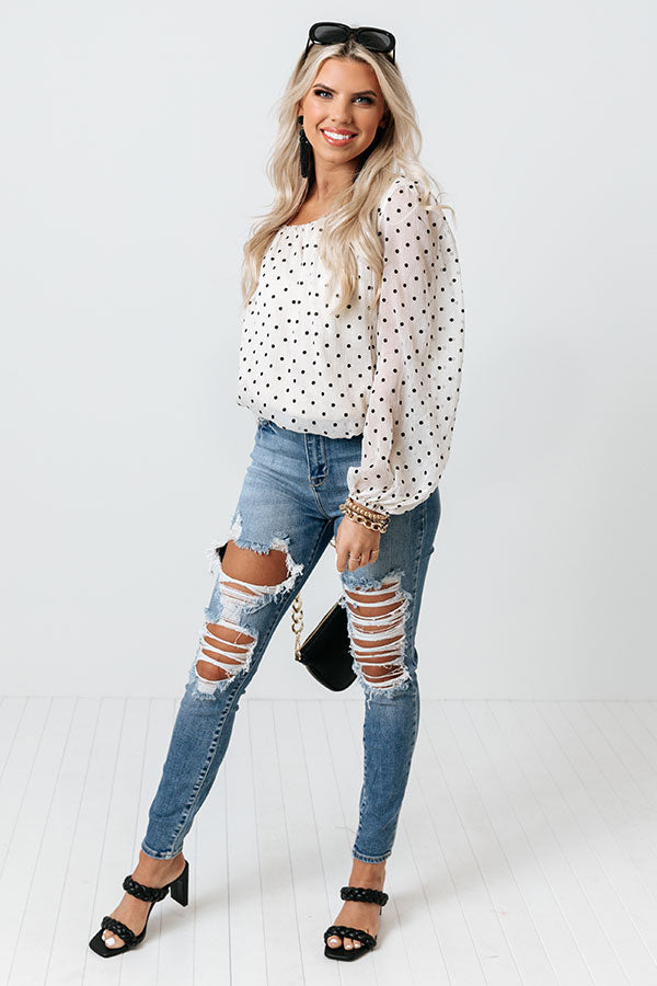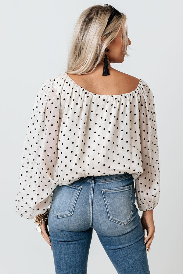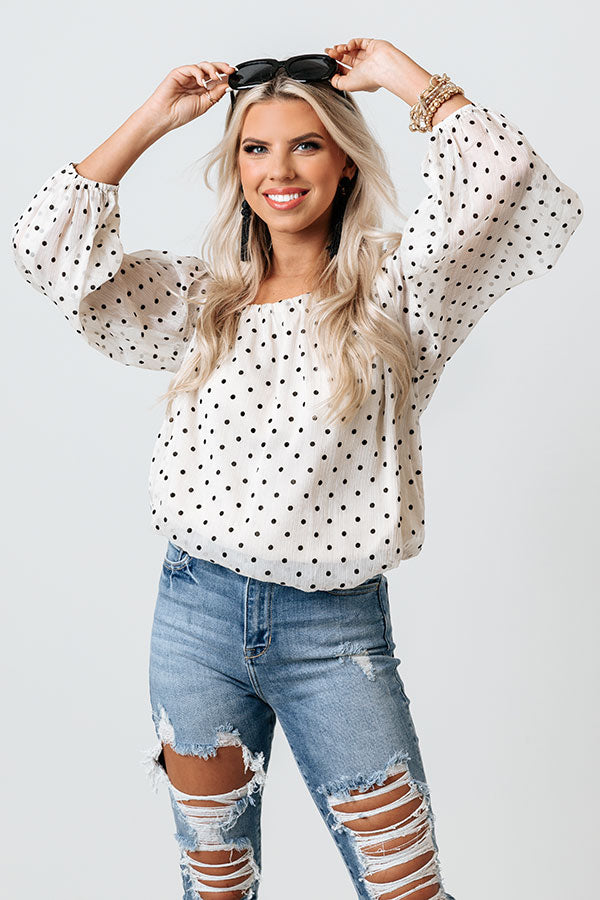 Slay all day in our chic cream colored 'Sign Of The Times Shift Top' featuring lightweight flowy material patterned with black polka dots, a wide scooped neckline, long bubble sleeves, and a slouched silhouette that ends in a straight elastic hemline!