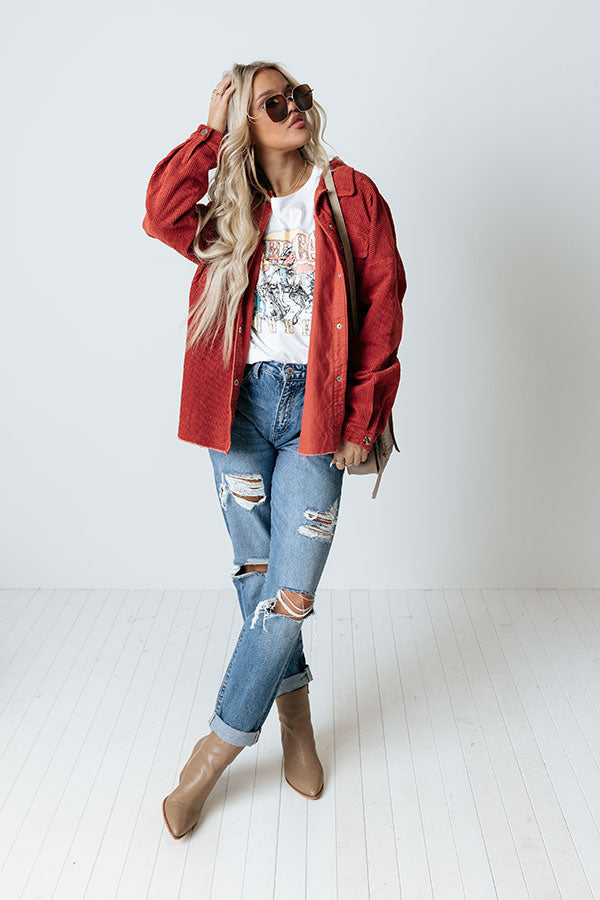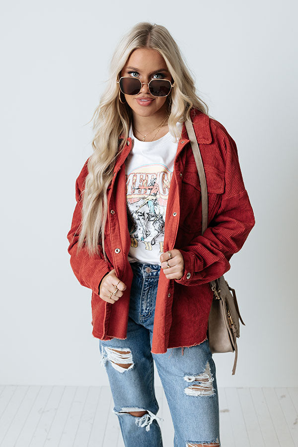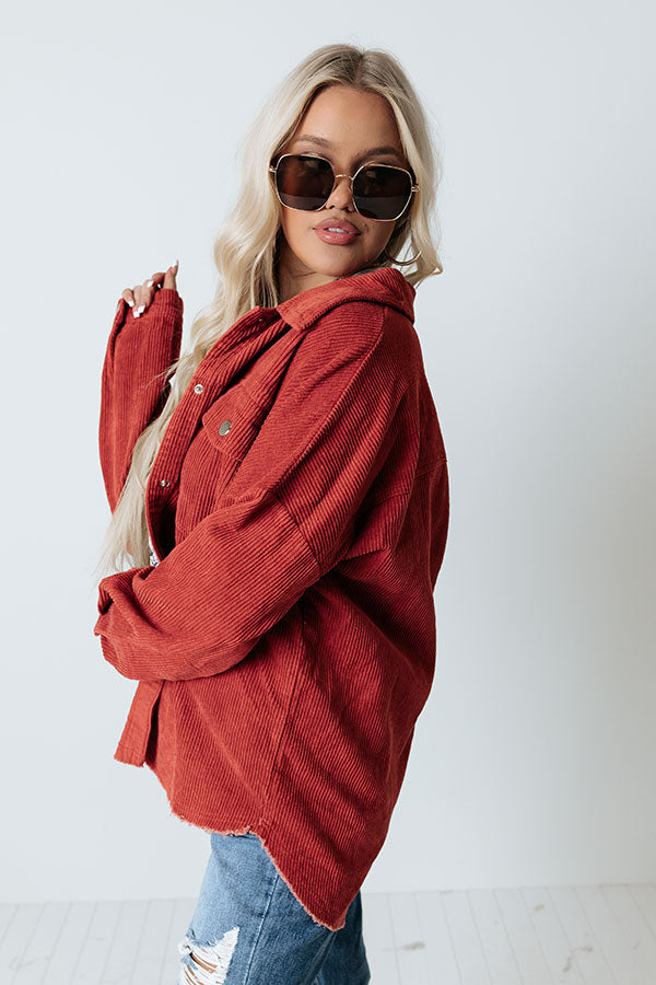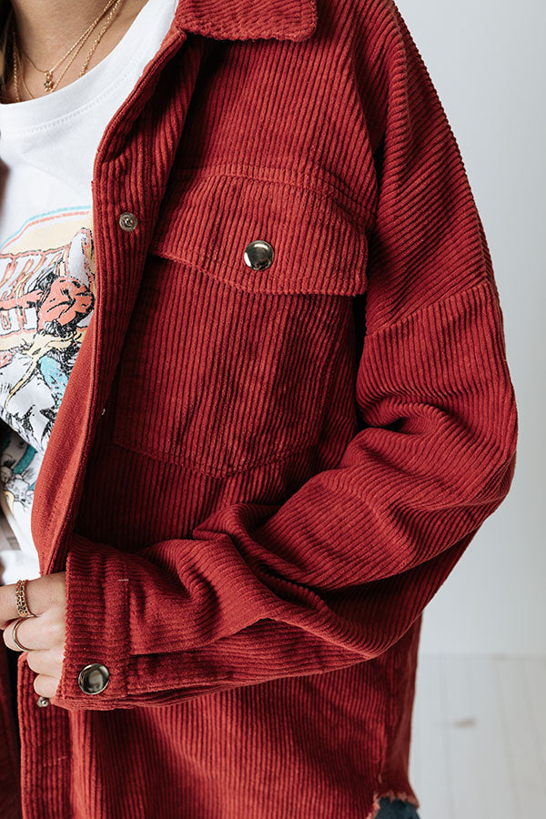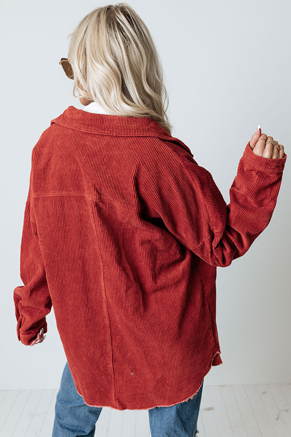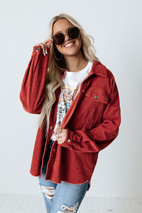 Layer up on trend with our cute aurora red hued 'Signature Move' jacket featuring warm material with corduroy texturing, a button down front with a collared neckline, long loose sleeves with button closure cuffs, two accent chest pockets with flap closures, and a relaxed silhouette that falls into a rounded raw-cut hemline! Measurements