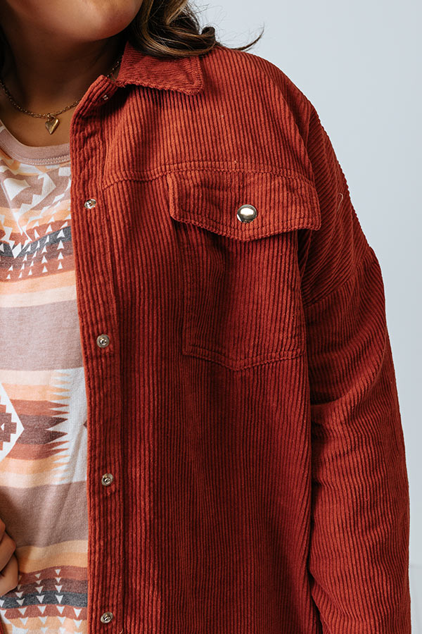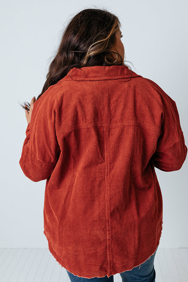 Layer up on trend with our cute aurora red hued plus size 'Signature Move' jacket featuring warm material with corduroy texturing, a button down front with a collared neckline, long loose sleeves with button closure cuffs, two accent chest pockets with flap closures, and a relaxed silhouette that falls into a rounded raw-cut hemline! Measurements