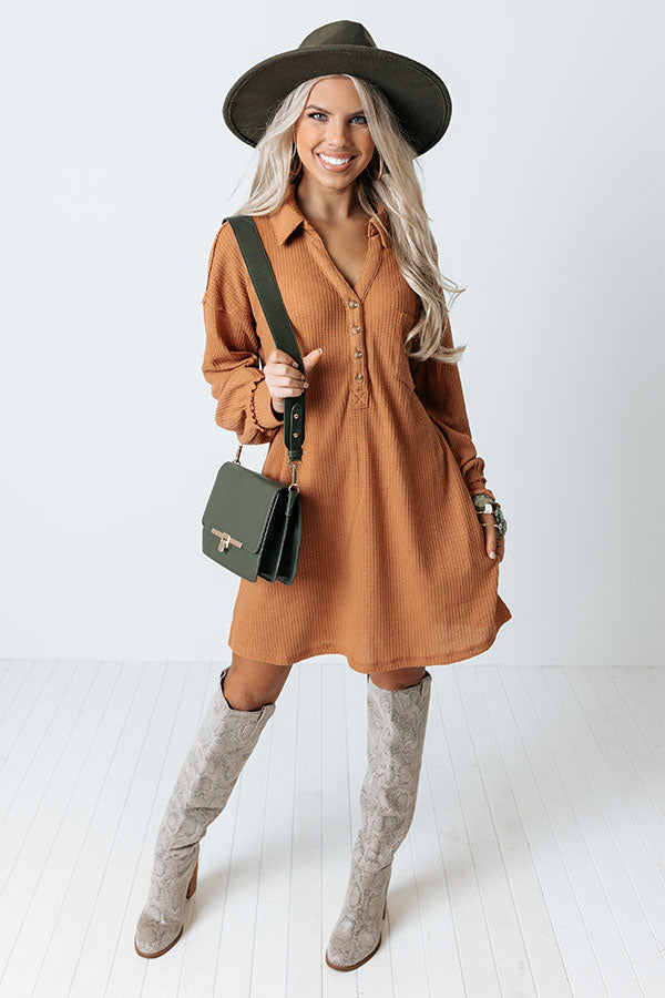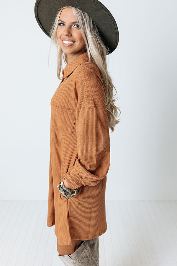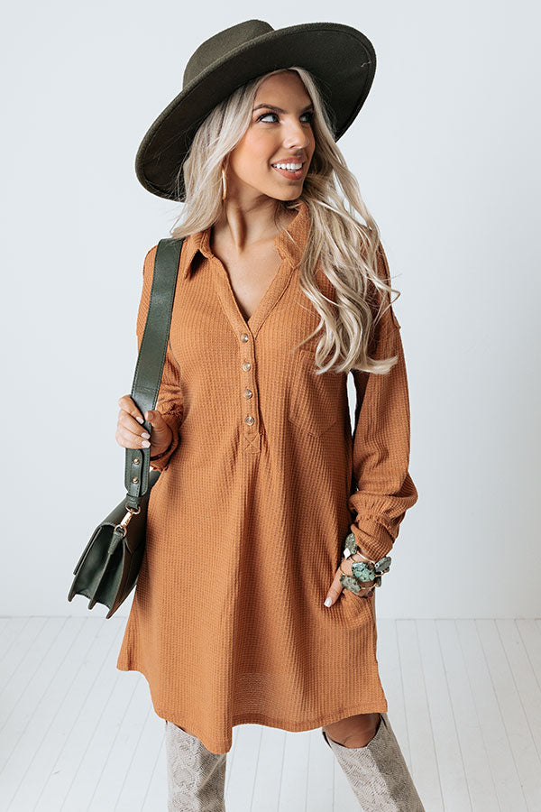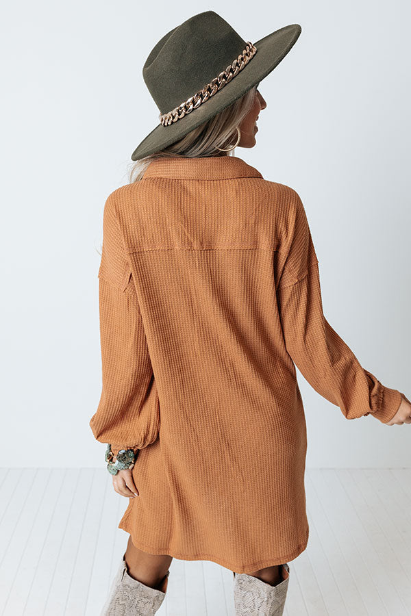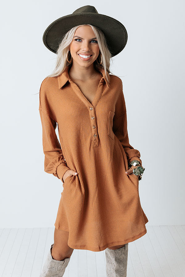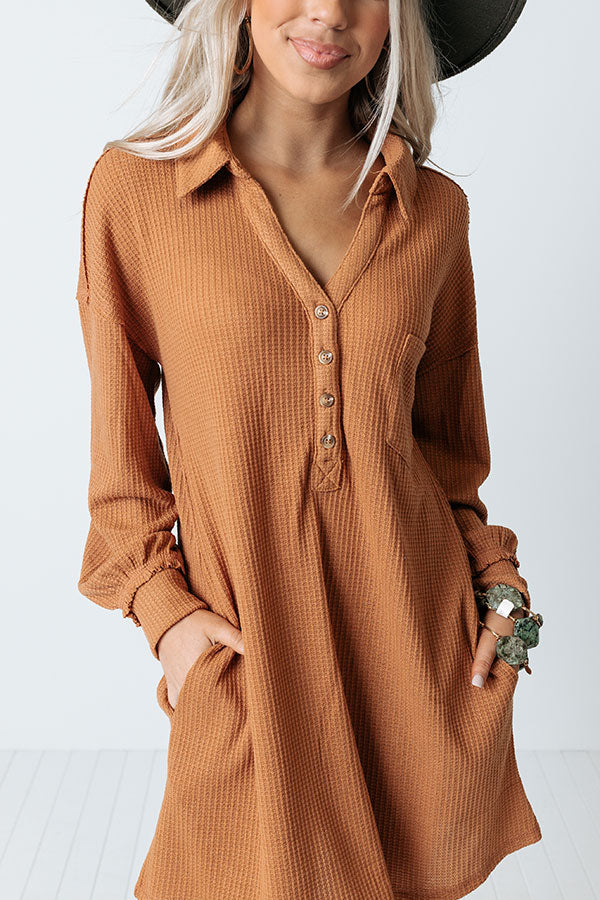 Leave your signature on the fashion world with this adorable camel colored dress featuring lightweight material with waffle knit texturing, a button up bodice with a collared v-cut neckline, long loose sleeves with fitted cuffs, hidden side pockets, a single accent chest pocket, and a relaxed silhouette that falls into a straight mid-thigh length hemline!