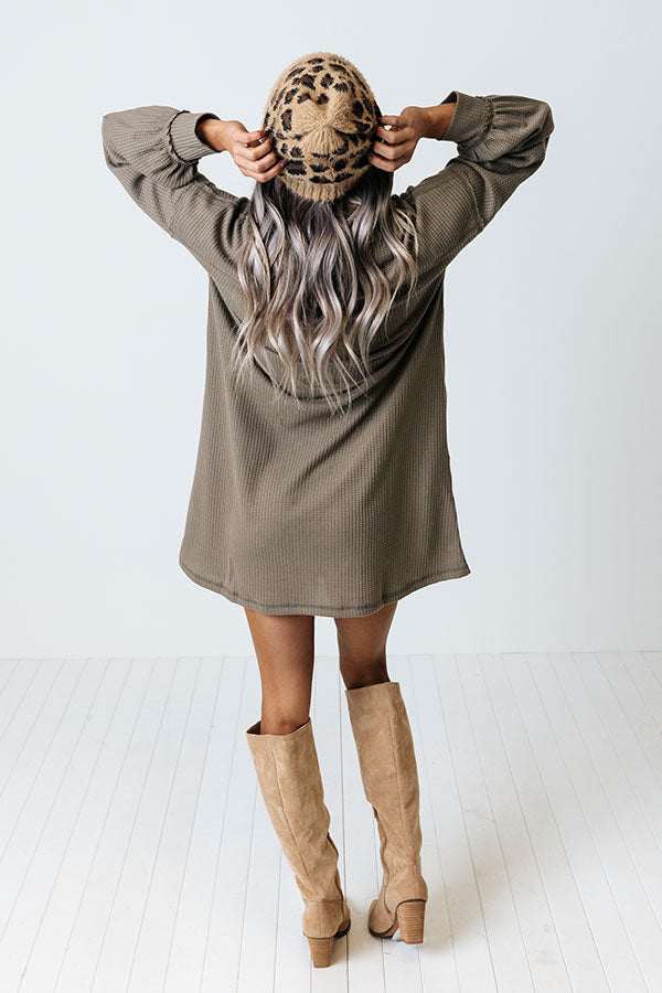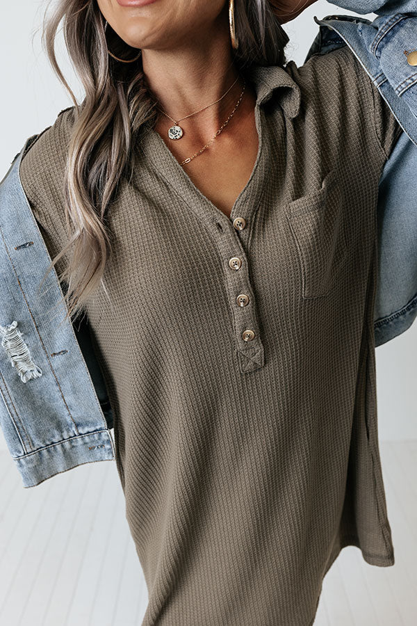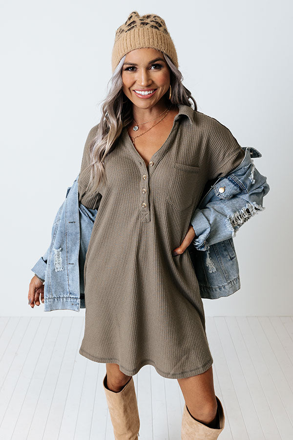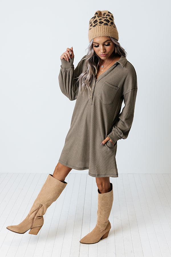 Leave your signature on the fashion world with this adorable martini olive colored dress featuring lightweight material with waffle knit texturing, a button up bodice with a collared v-cut neckline, long loose sleeves with fitted cuffs, hidden side pockets, a single accent chest pocket, and a relaxed silhouette that falls into a straight mid-thigh length hemline! Measurements