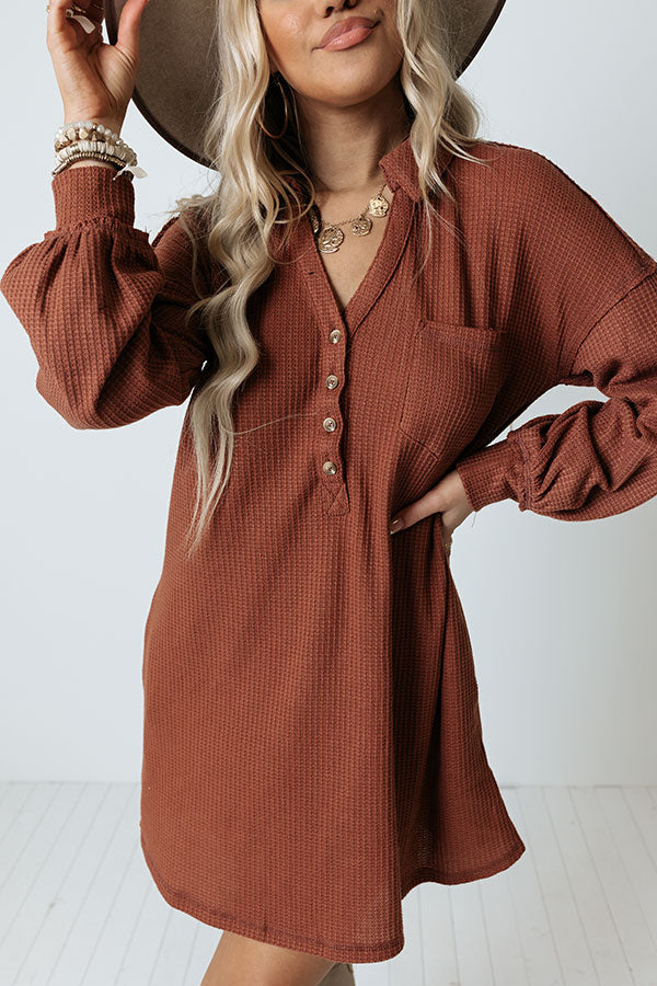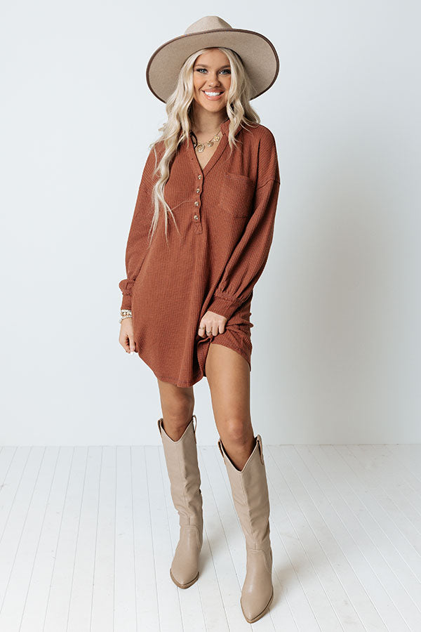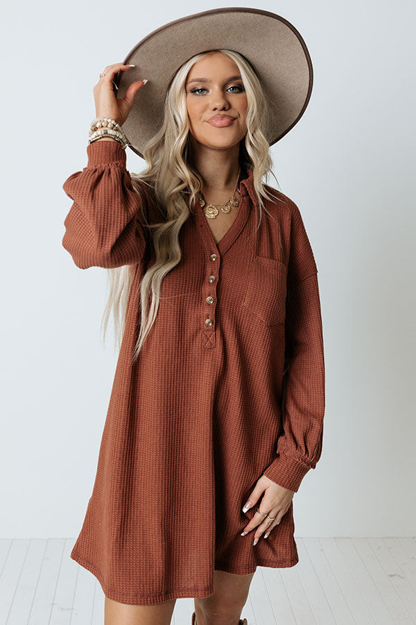 Leave your signature on the fashion world with this adorable rust colored dress featuring lightweight material with waffle knit texturing, a button up bodice with a collared v-cut neckline, long loose sleeves with fitted cuffs, hidden side pockets, a single accent chest pocket, and a relaxed silhouette that falls into a straight mid-thigh length hemline! Measurements