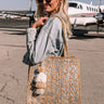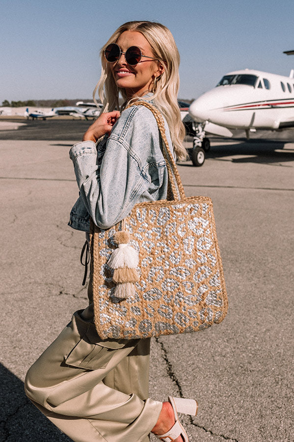 Our fave new summer bag just dropped! This eye-catching tote features handwoven jute material patterned with a silver leopard print, two handles, a spacious interior, and an oversized pom pom tassel accent!